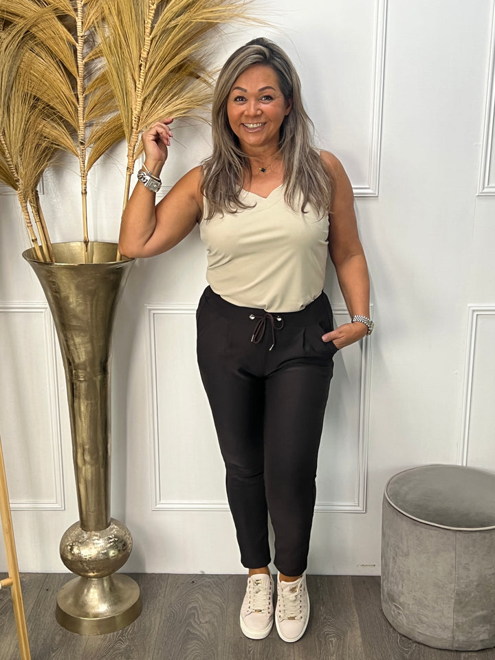 - Model: Eén van onze bestsellers. De welbekende Angelia tregging broek met twee steekzakjes, een aanrijgkoordje rondom de tailleband en voorzien van lekker veel stretch. Kortom: een heer-lijk broekje! Verkrijgbaar in verschillende maatsoorten.