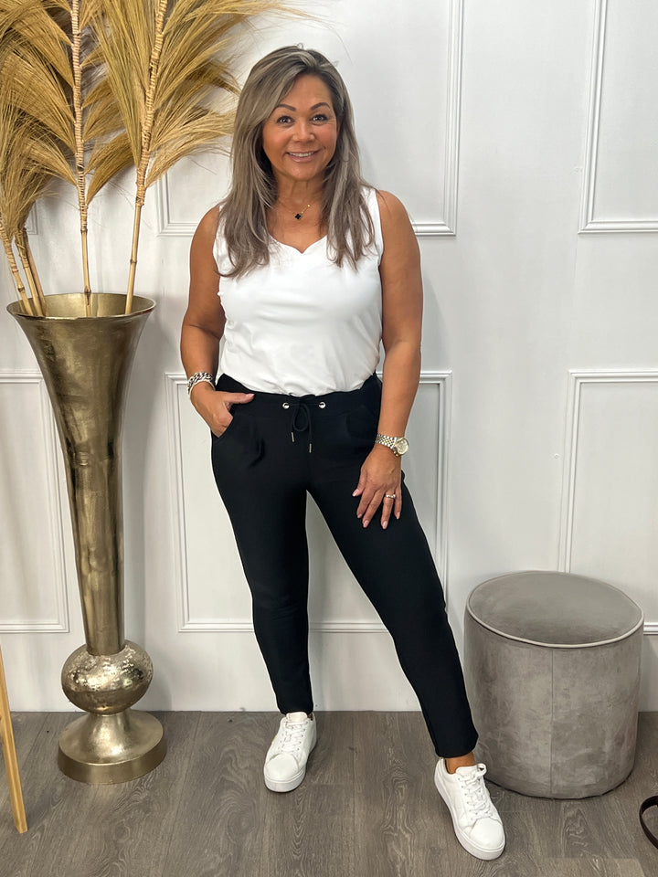 - Model: Eén van onze bestsellers. De welbekende Angelia tregging broek met twee steekzakjes, een aanrijgkoordje rondom de tailleband en voorzien van lekker veel stretch. Kortom: een heer-lijk broekje! Verkrijgbaar in verschillende maatsoorten.