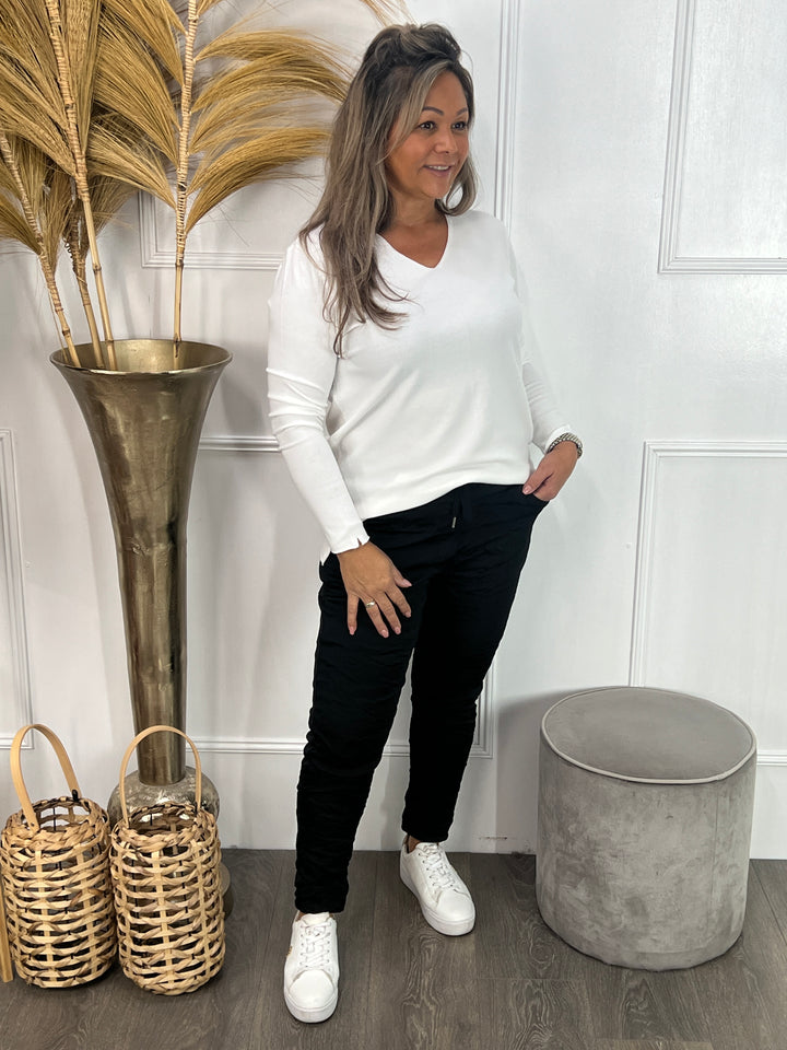 - Model: Een super zacht en fijn gebreid truitje met lange mouwen, een v-hals en twee subtiele splitjes aan de onderkant. Hier gecombineerd op onze nieuwe satin stretch broek Sia.