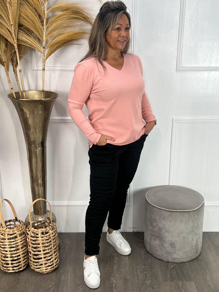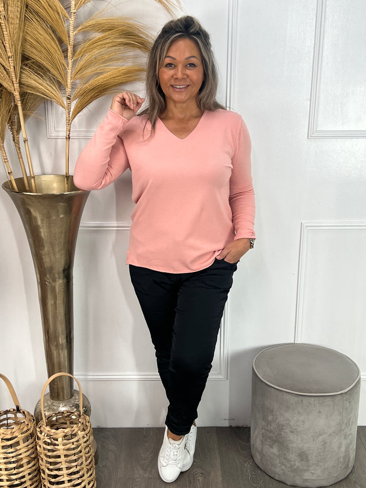 - Model: Een super zacht en fijn gebreid truitje met lange mouwen, een v-hals en twee subtiele splitjes aan de onderkant. Hier gecombineerd op onze nieuwe satin stretch broek Sia.