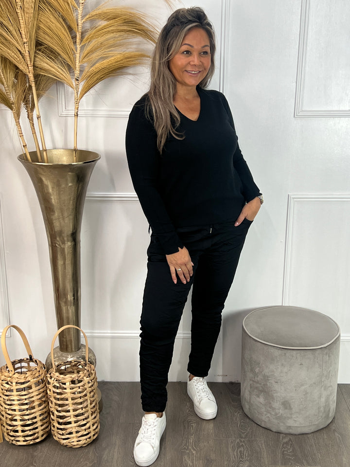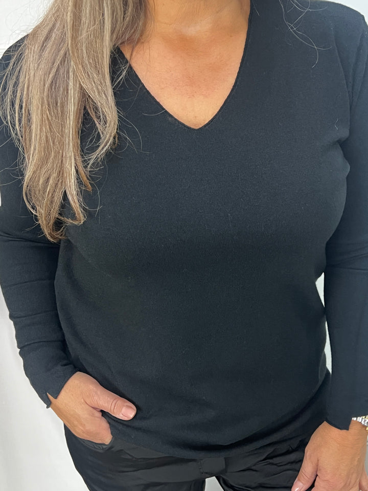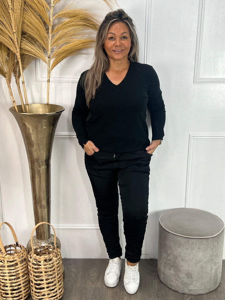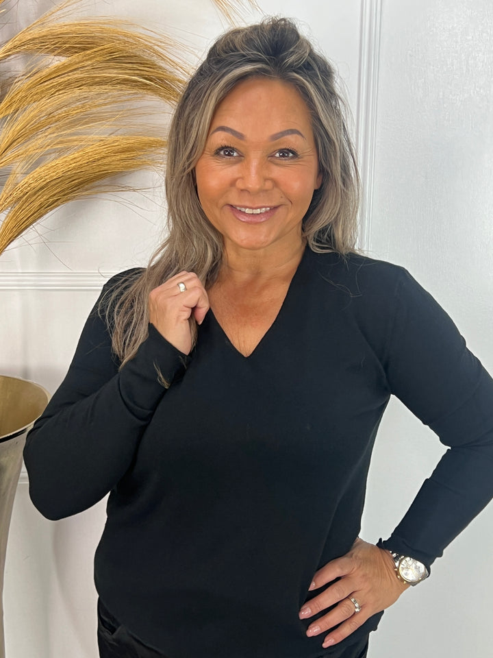 - Model: Een super zacht en fijn gebreid truitje met lange mouwen, een v-hals en twee subtiele splitjes aan de onderkant. Hier gecombineerd op onze nieuwe satin stretch broek Sia.