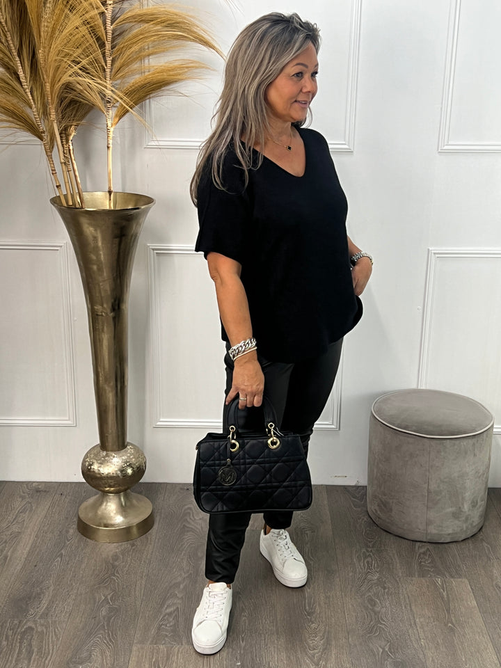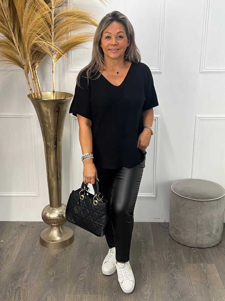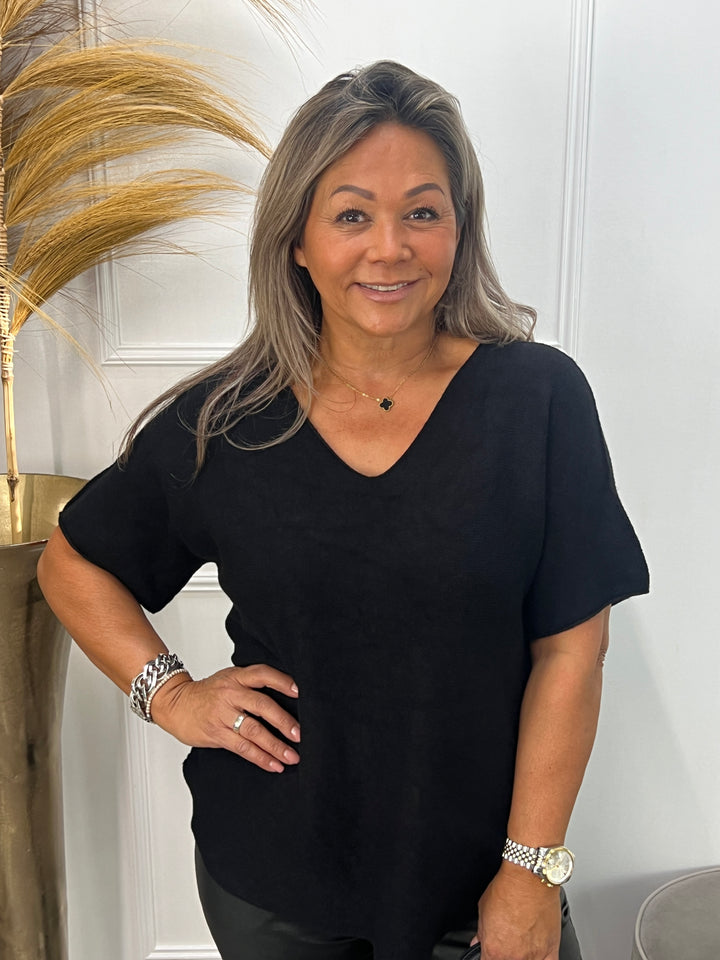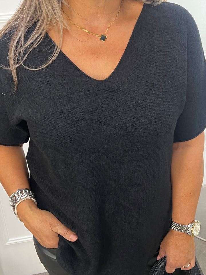- Model: Een heel fijn basis truitje met korte mouwen en een v-hals. Echt perfect om onder een blazer of jackie te dragen. Verkrijgbaar in verschillende kleuren. Welke kleur is jouw favoriet.