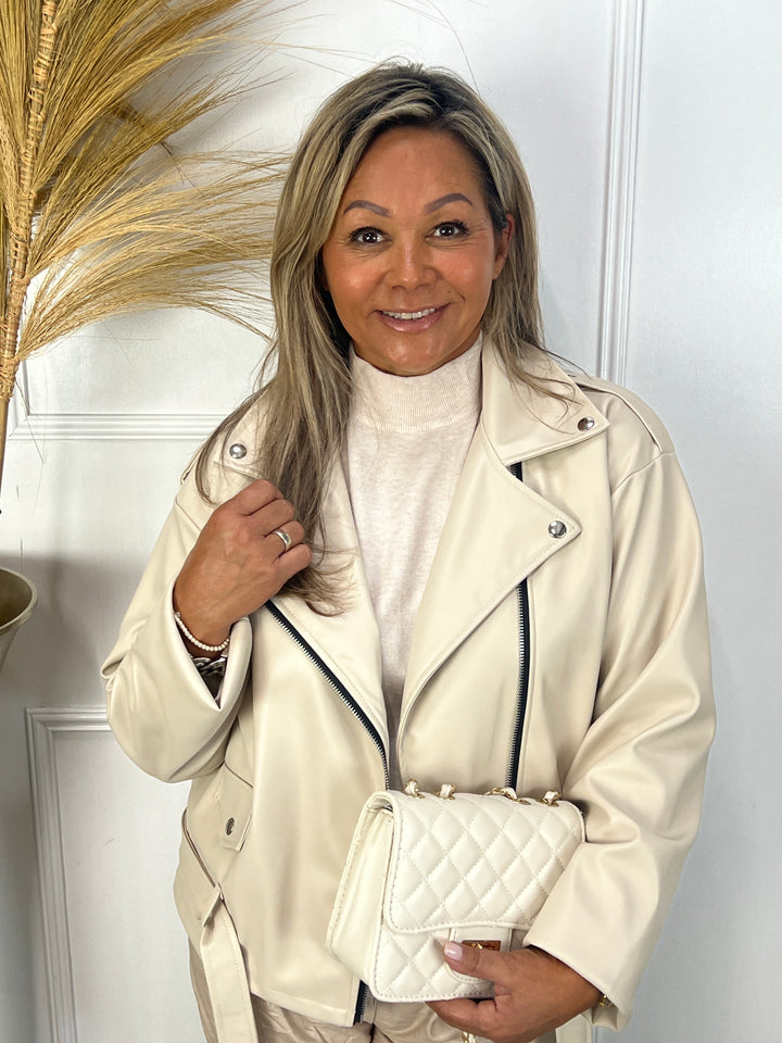 - Model: Een super leuk en stoer bikerjack met een sluitingsrits en een los ceintuur. Met dit jack kun jij jouw outfit lekker stoer aftoppen.
