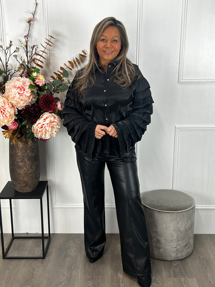 - Model: Een hele mooie, chique, doorschijnende blouse met enorm leuke, speelse mouwen. Echt een plaatje! Voorzien van een doorknoop met bling bling knoopjes.
