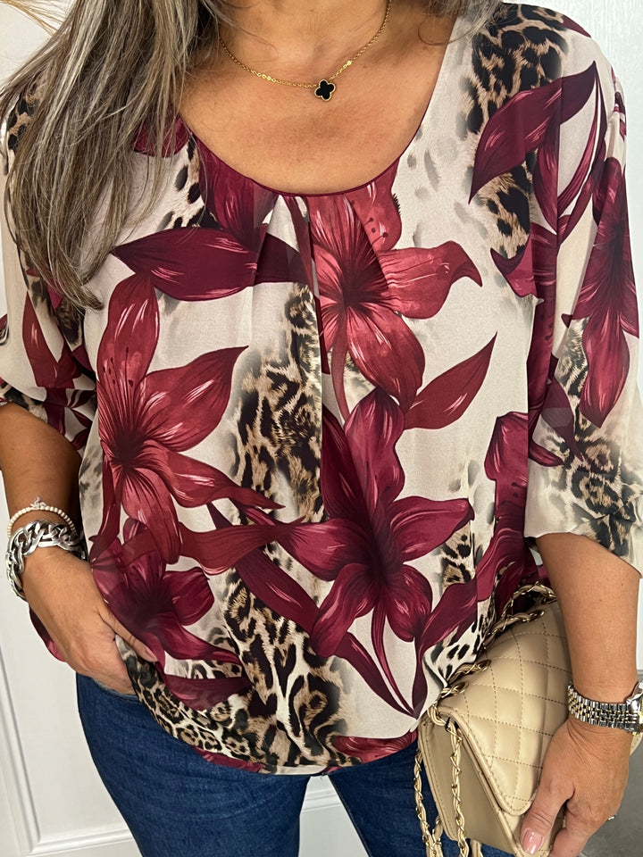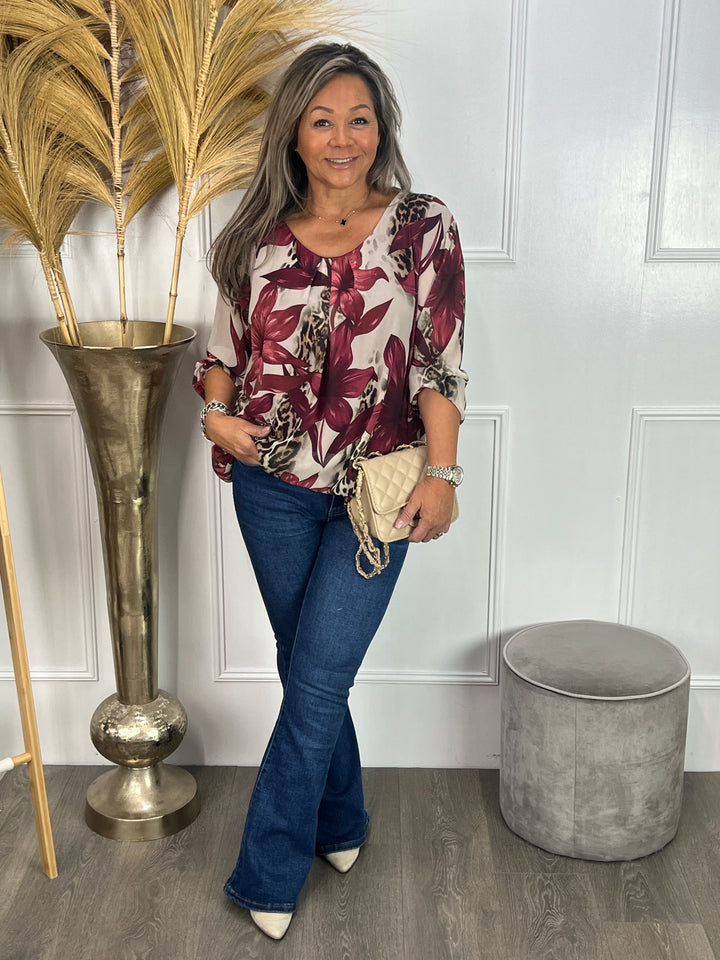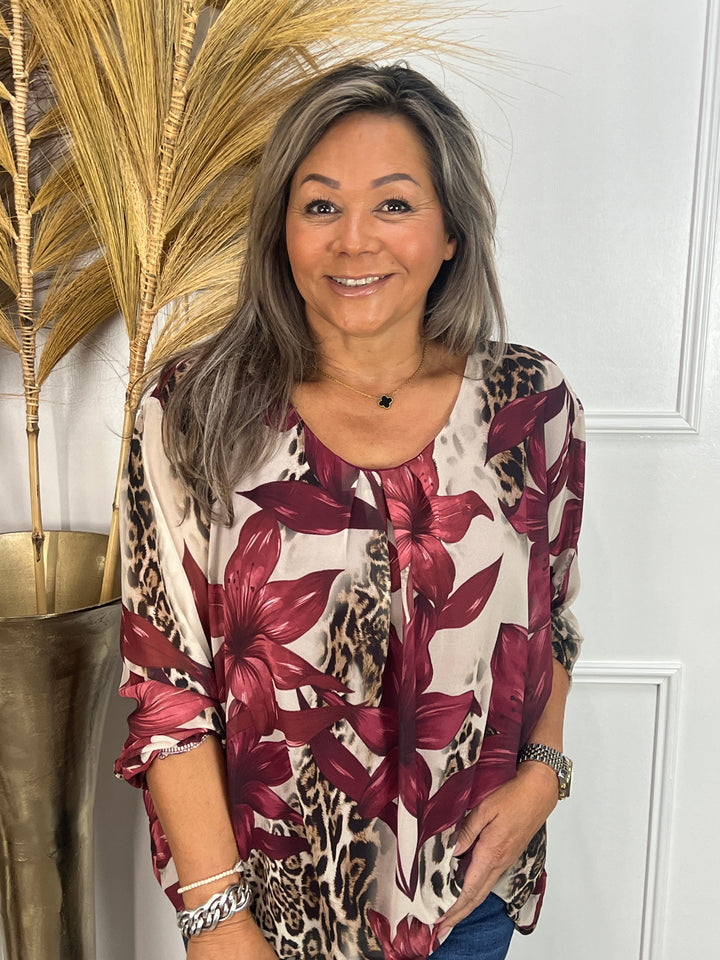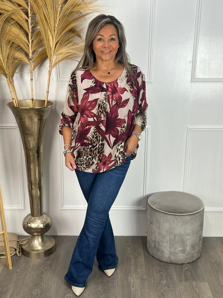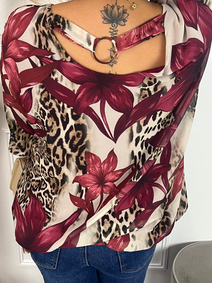 - Model: Een hele leuke, ruimvallende, gevoerde blouse met een leuk detail op de rug in de nek. Voorzien van een gezellige print en verkrijgbaar in warme kleuren.