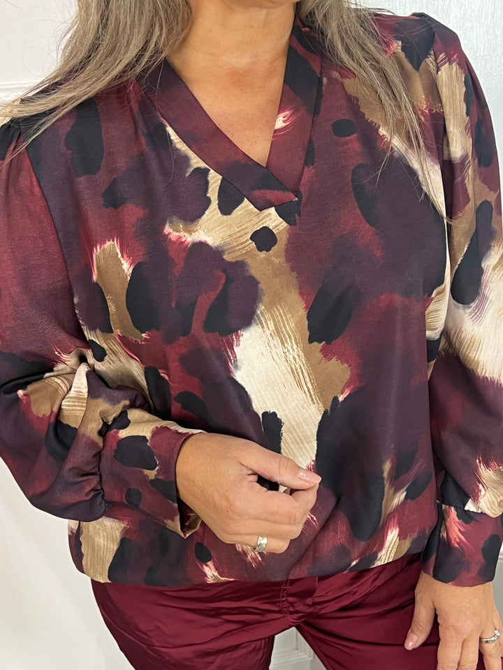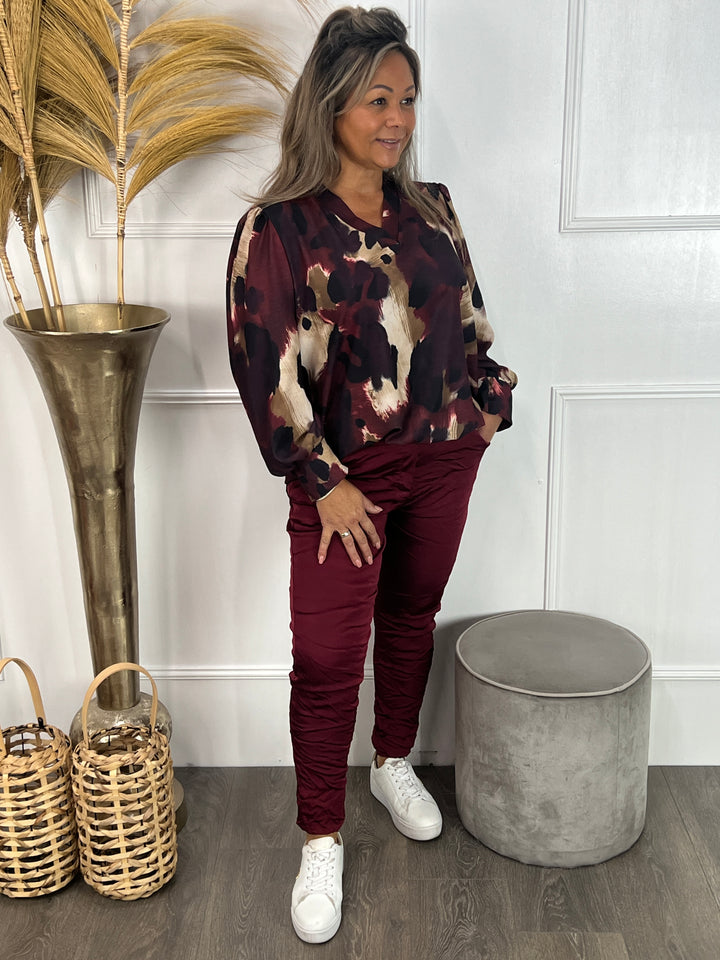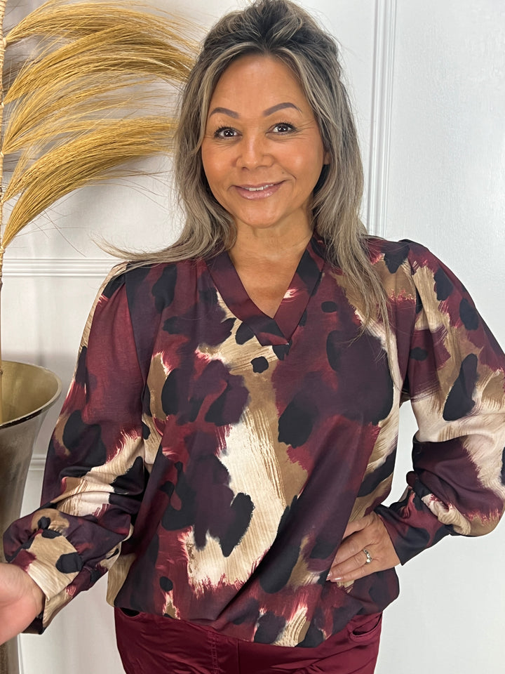 - Model: Een prachtige blouse met pofmouwen, een v-hals en een hele mooie print. Mooi te combineren op bijvoorbeeld onze satin stretch broek Sia, die wij overigens ook in meerdere kleuren aanbieden.