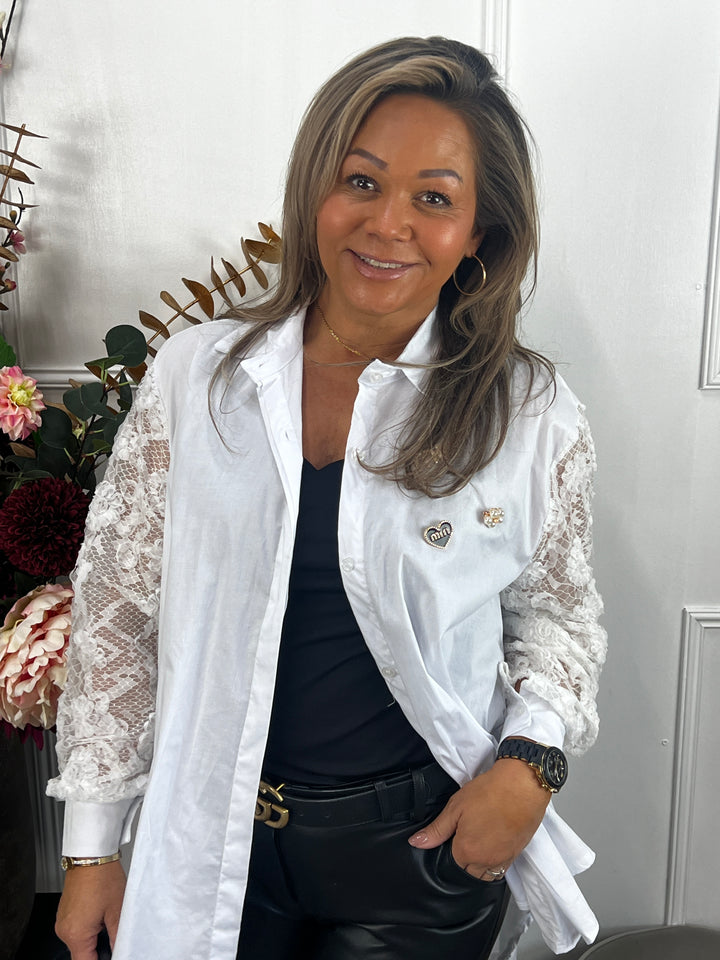 - Model: Een prachtige katoenen doorknoop blouse met hele mooie, kanten mouwen. Kriebelt niet! Echt een pareltje weer... Voorzien van drie losse broches die je naar eigen wens kunt verplaatsen of zelfs eraf kunt halen. Ga jij voor zwart of wit?