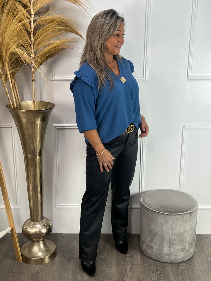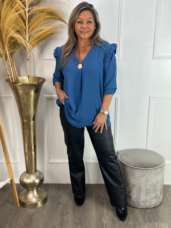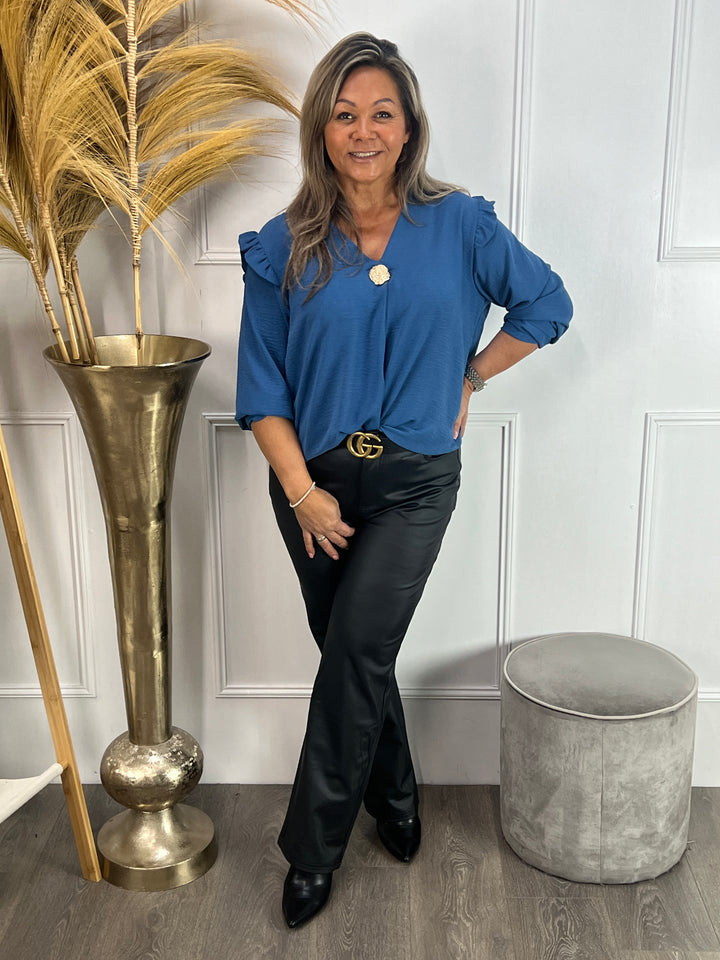 - Model: Een hele fijne, leuke blouse met lange mouwen, een v-hals, een subtiel roezel randje op de schouders en een goudkleurige broche die je er eventueel ook af kunt halen. Verkrijgbaar in diverse kleuren.