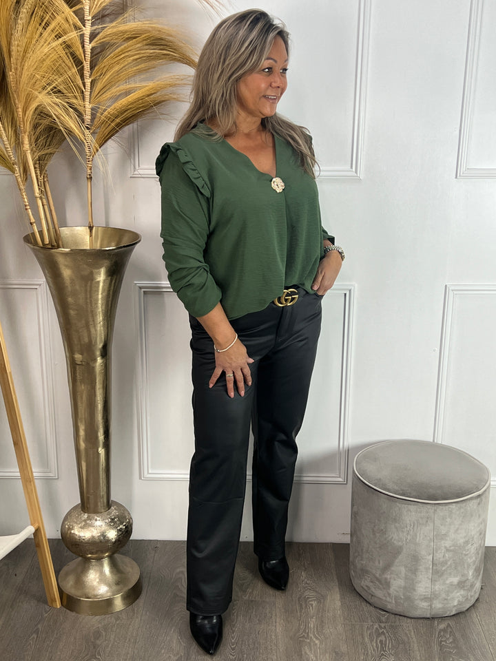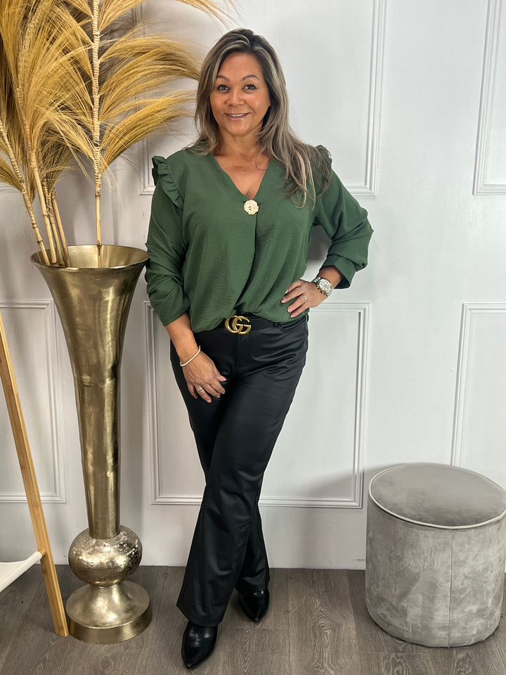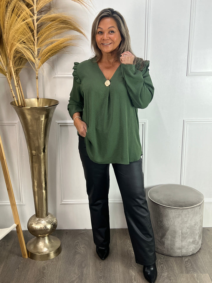 - Model: Een hele fijne, leuke blouse met lange mouwen, een v-hals, een subtiel roezel randje op de schouders en een goudkleurige broche die je er eventueel ook af kunt halen. Verkrijgbaar in diverse kleuren.