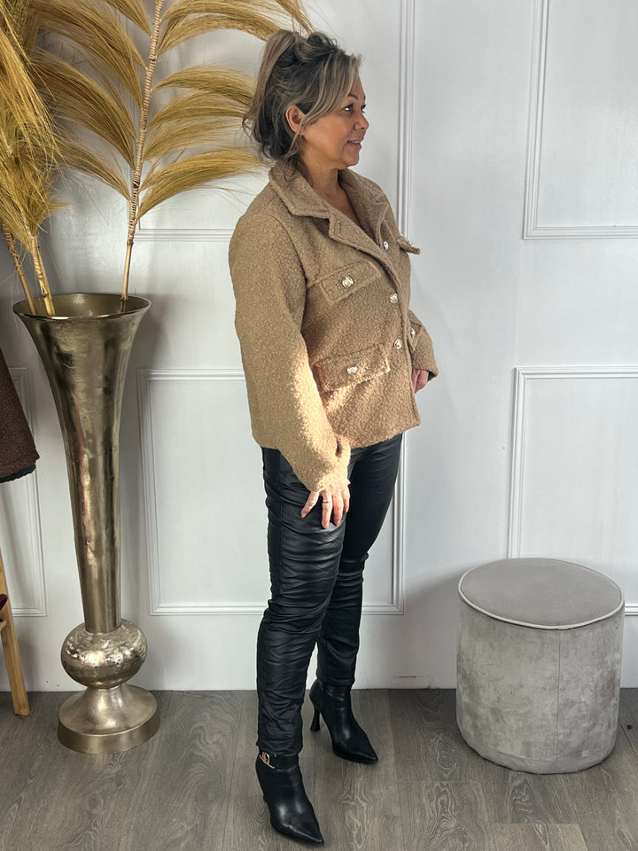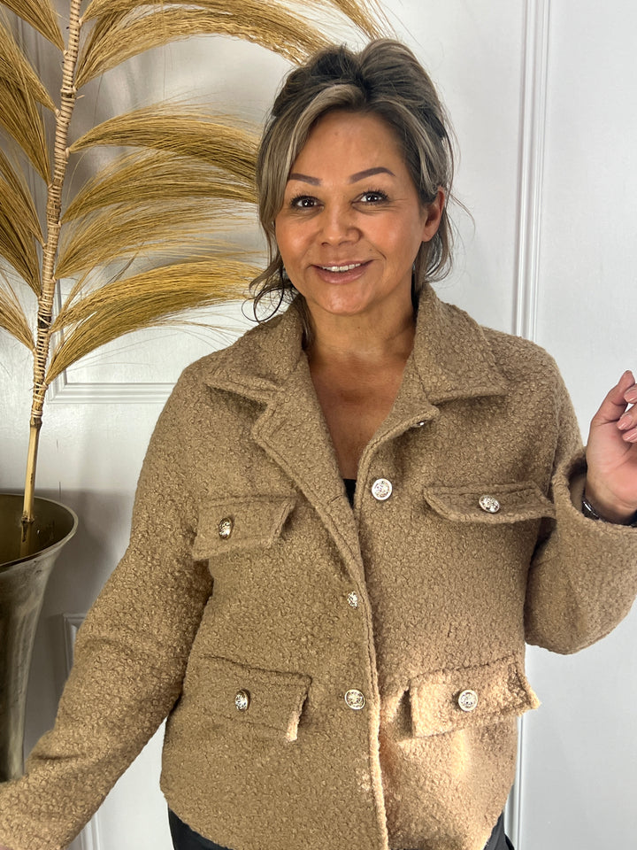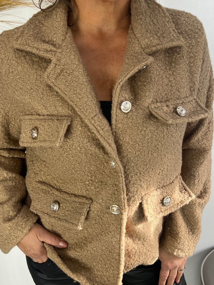 - Model: Een kort bouclé jasje met een kraagje, goudkleurige knoopjes en vier sierzakken aan de voorkant. Helemaal leuk, helemaal hip. Kan als tussenjas gedragen worden, maar zeer zeker ook als een vest/ jackie.