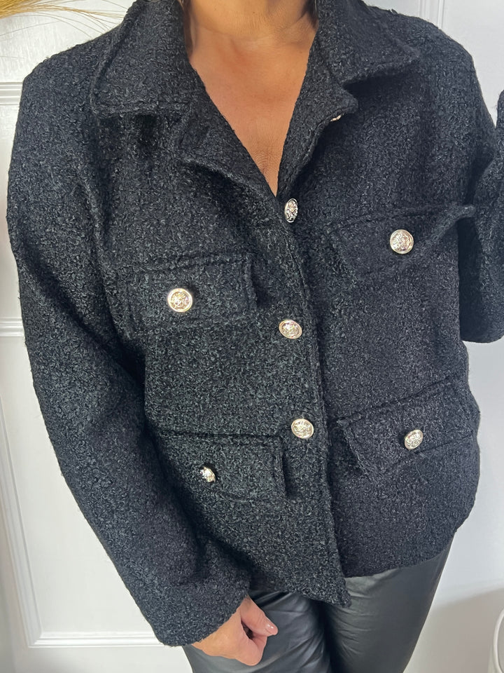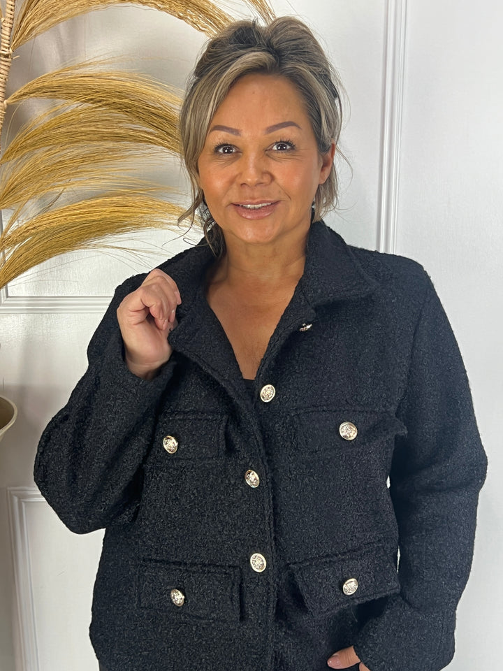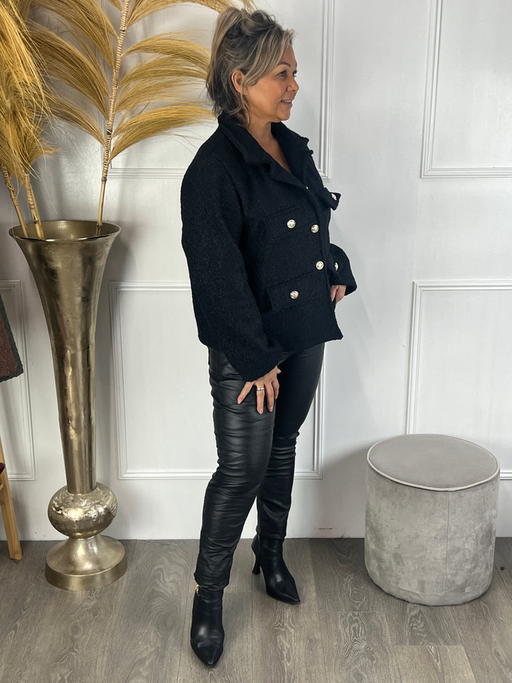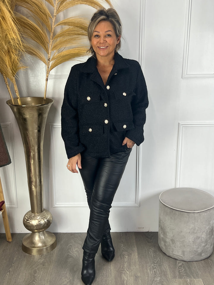- Model: Een kort bouclé jasje met een kraagje, goudkleurige knoopjes en vier sierzakken aan de voorkant. Helemaal leuk, helemaal hip. Kan als tussenjas gedragen worden, maar zeer zeker ook als een vest/ jackie.