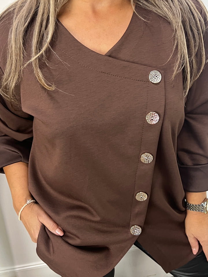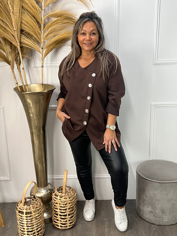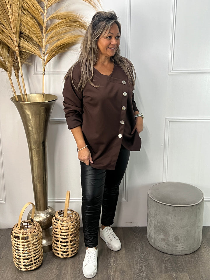 - Model: Een bijzondere sweater met sierknopen aan de voorkant, waardoor het net lijkt alsof je een soort blazer aanhebt. Dat is het niet, het is echt een sweater met een bijzonder leuk button detail.