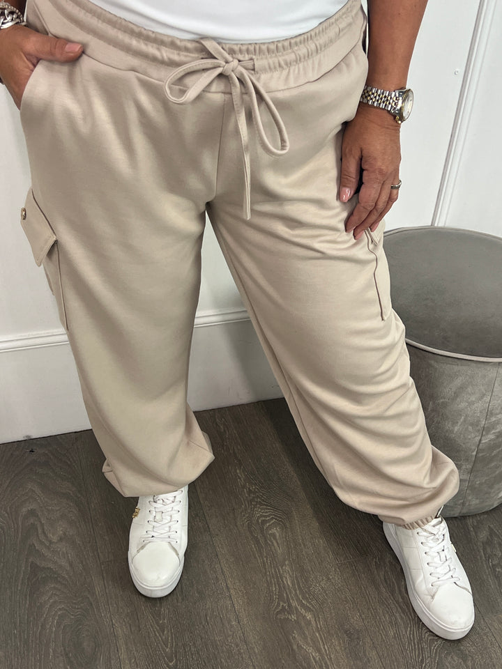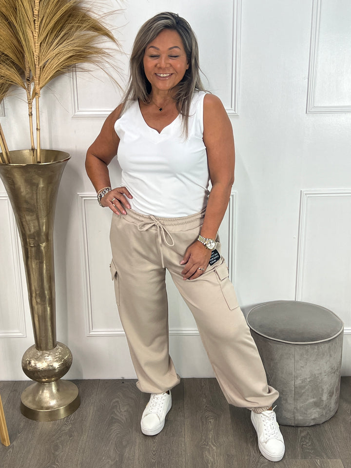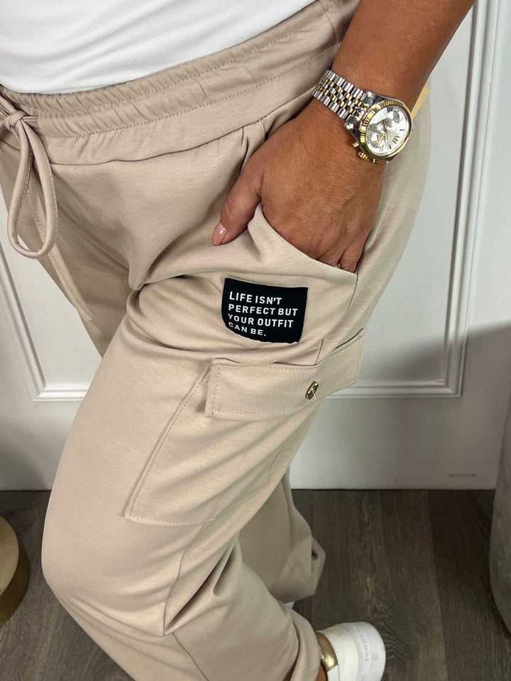 - Model: Trendy cargo broek met embleem. Stoer én comfy! Deze cargo broek heeft een relaxte pasvorm met elastische taille en handige zakken. Op de broek zit een speels embleem met de tekst “Life isn’t perfect but your outfit can be”.