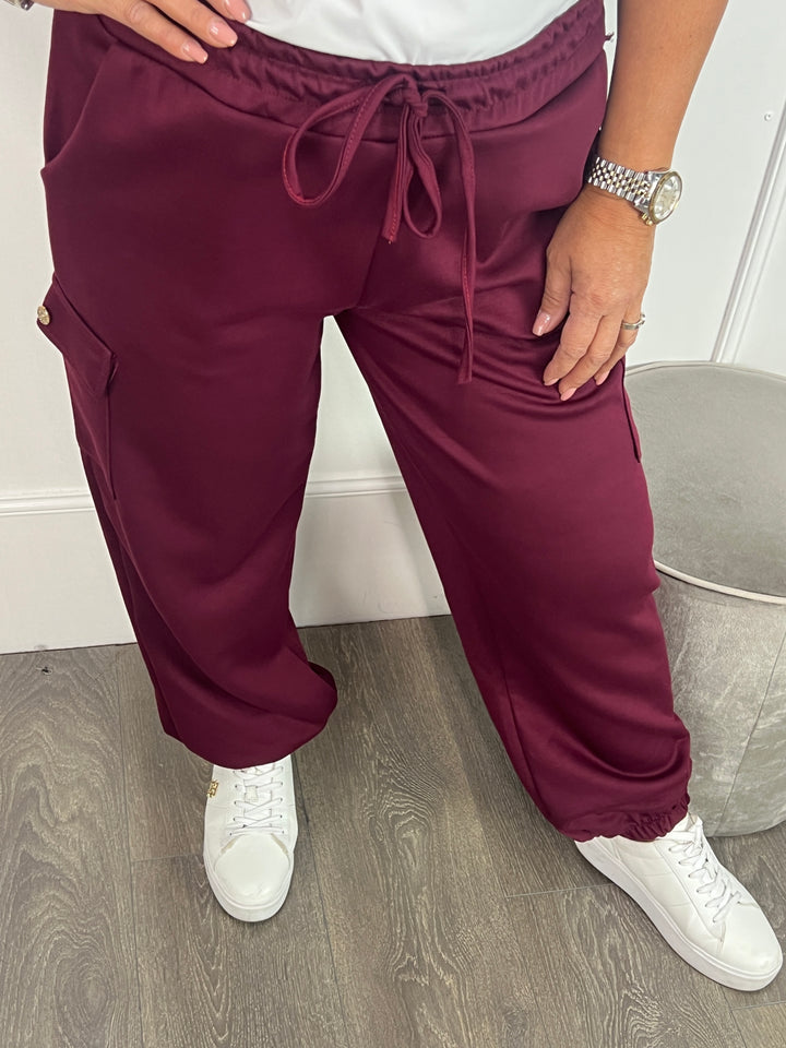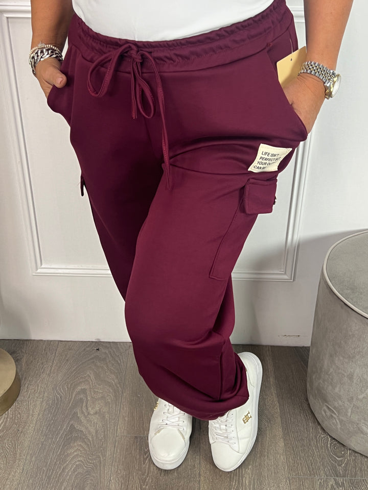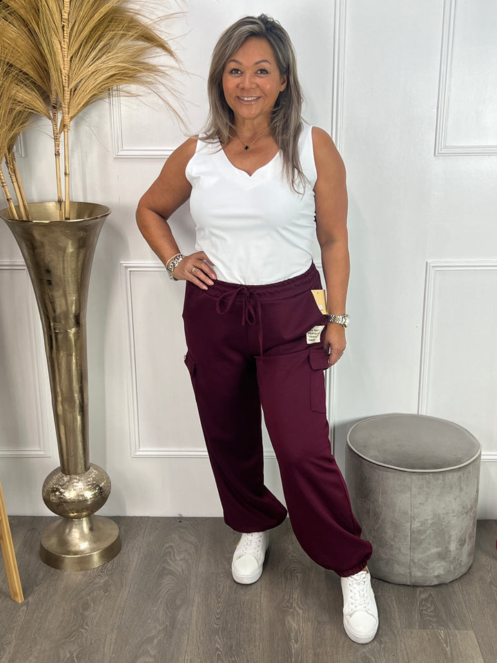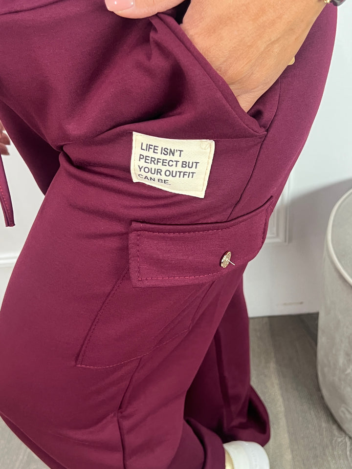 - Model: Trendy cargo broek met embleem. Stoer én comfy! Deze cargo broek heeft een relaxte pasvorm met elastische taille en handige zakken. Op de broek zit een speels embleem met de tekst “Life isn’t perfect but your outfit can be”.