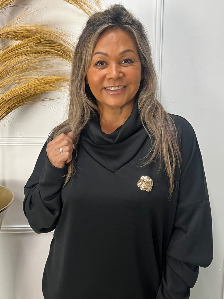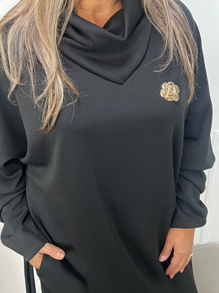 - Model: Echt een heel bijzonder en leuk comfy jurkje met een brede col, een ceintuur en een goudkleurige broche.