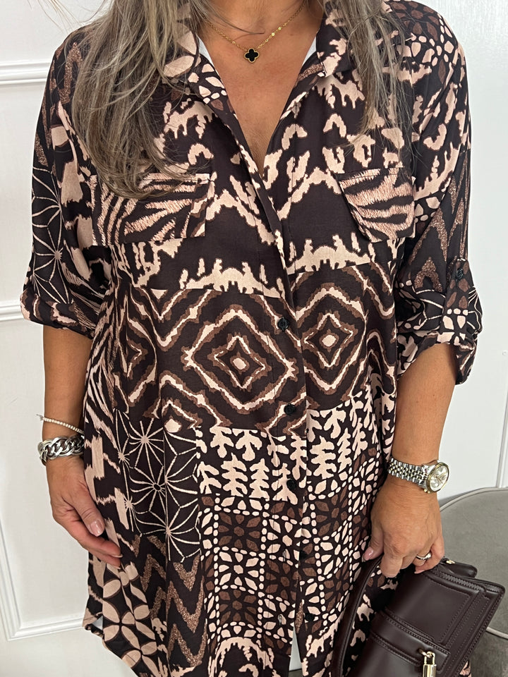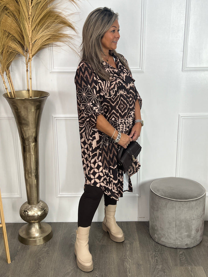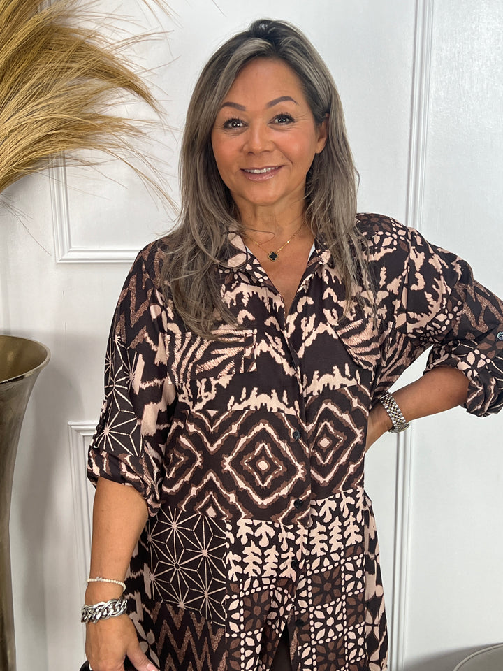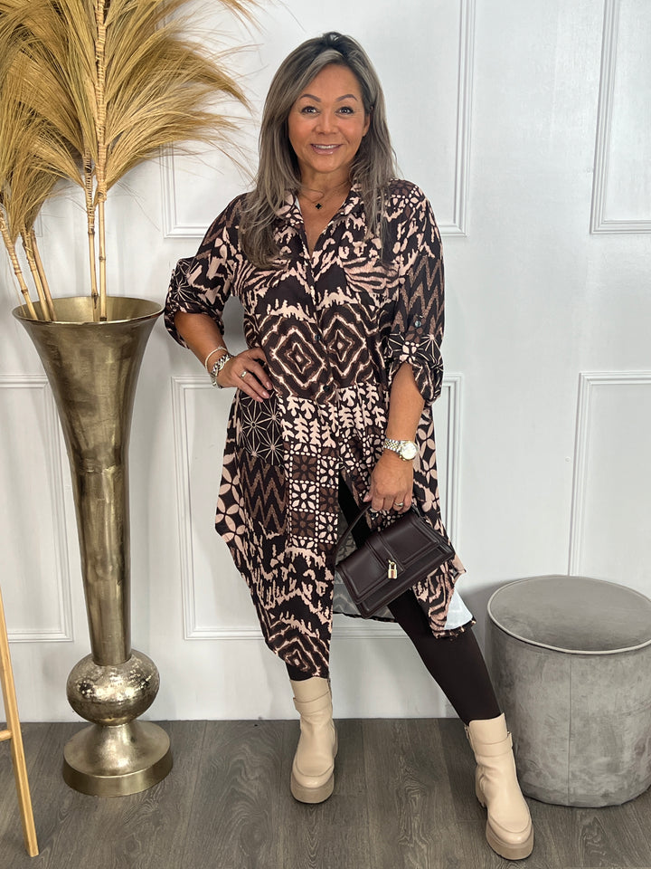 - Model: Een mooie, lange, doorknoopblouse met een hele leuke print. Verkrijgbaar in drie donkere, warme kleuren. Kan als jurk, tuniek, vestje of als blouse gedragen worden. Weer eindeloos te combineren dus!