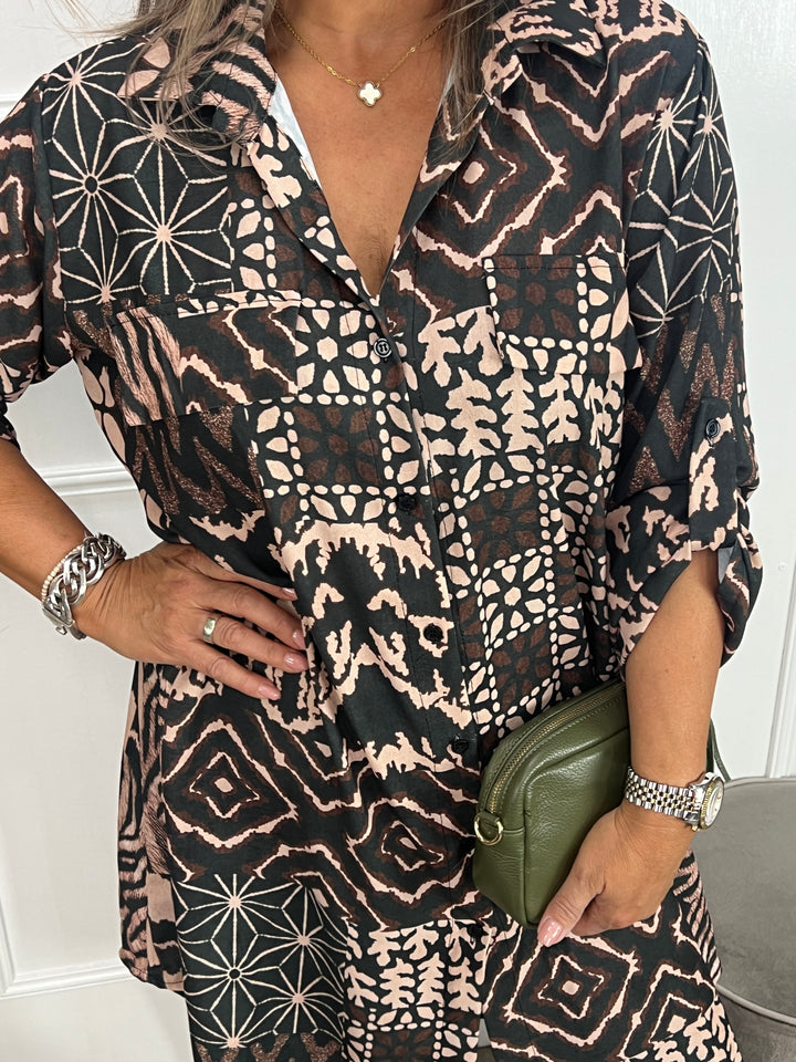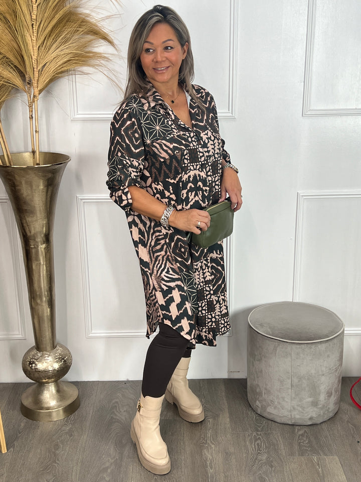 - Model: Een mooie, lange, doorknoopblouse met een hele leuke print. Verkrijgbaar in drie donkere, warme kleuren. Kan als jurk, tuniek, vestje of als blouse gedragen worden. Weer eindeloos te combineren dus!