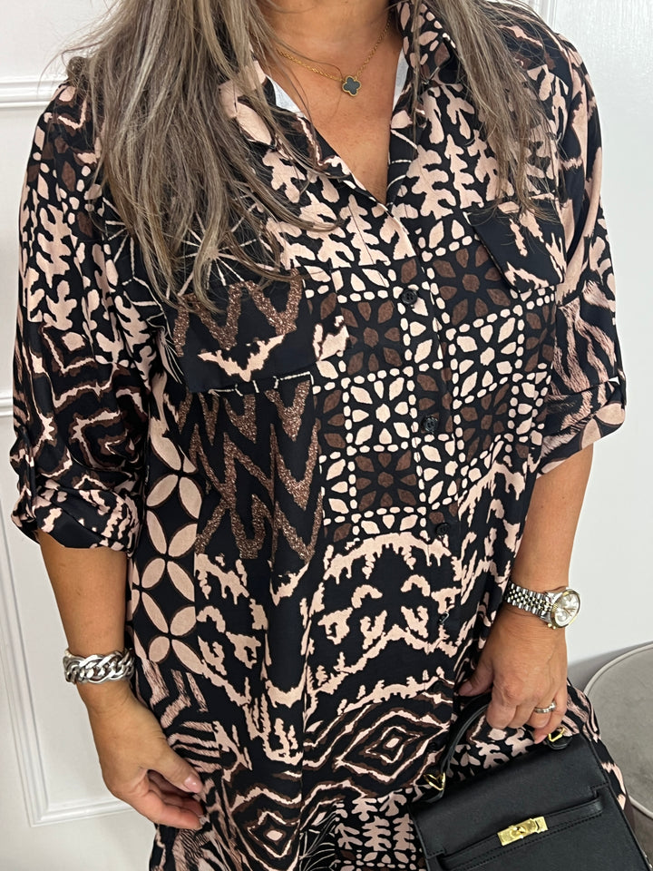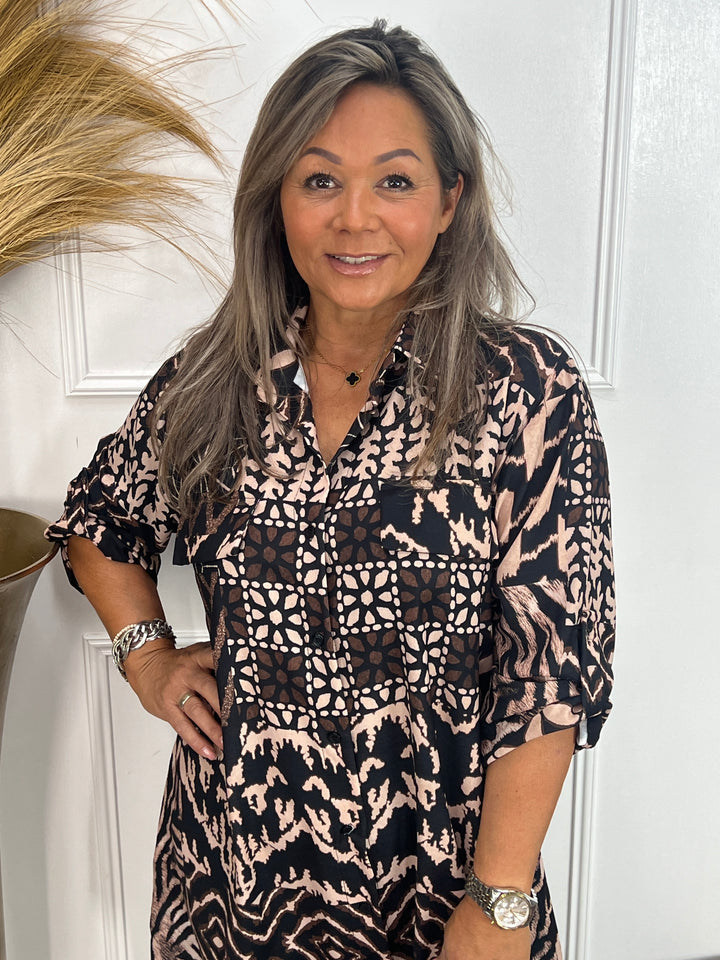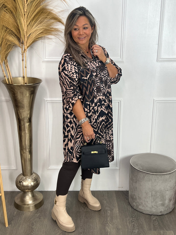 - Model: Een mooie, lange, doorknoopblouse met een hele leuke print. Verkrijgbaar in drie donkere, warme kleuren. Kan als jurk, tuniek, vestje of als blouse gedragen worden. Weer eindeloos te combineren dus!