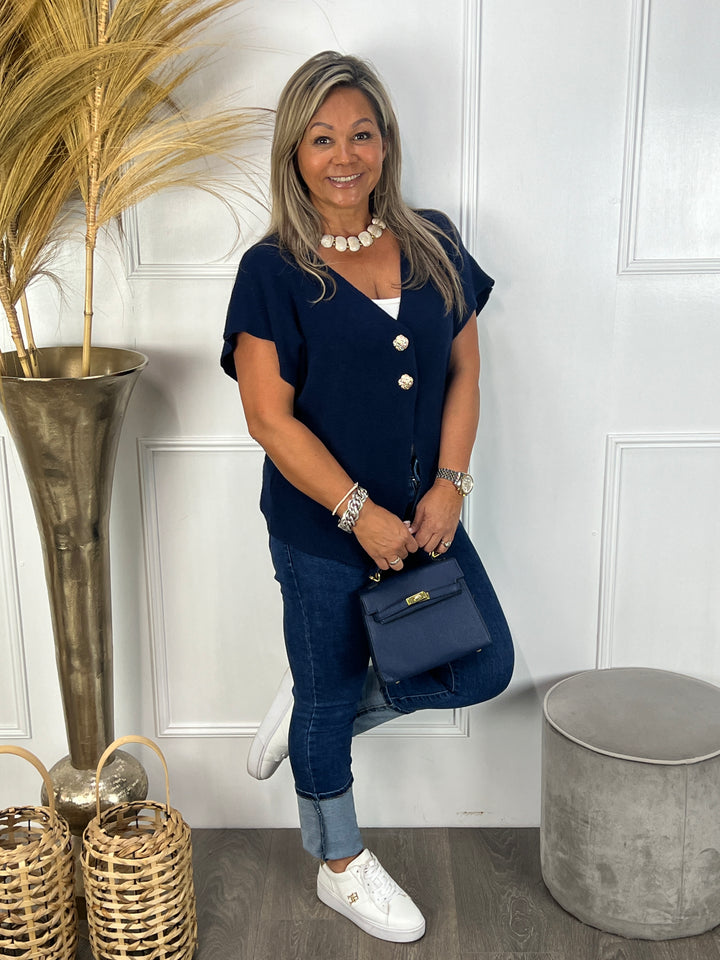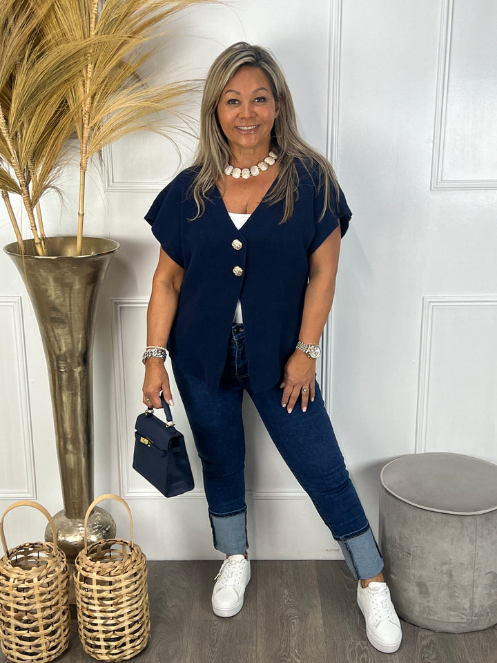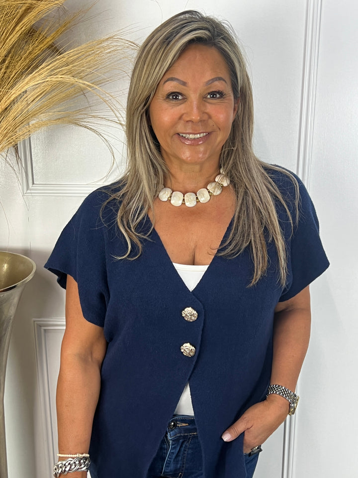 - Model: een heel leuk, super zacht, gilet vestje met korte mouwen en twee goudkleurige knopen aan de voorzijde.