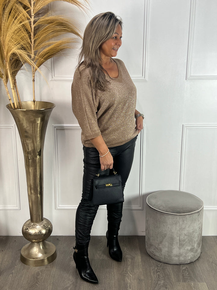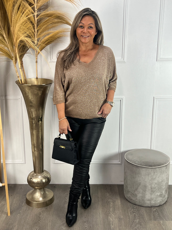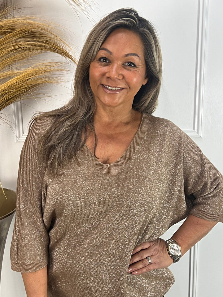 - Model: Kijk eens even hoe leuk weer. Een leuk, betaalbaar, glinsterend truitje met een v-hals en halflange mouwen. Perfect voor onder een blazer ook en sowieso wel een perfect truitje wat naar meerdere gelegenheden gedragen kan worden.