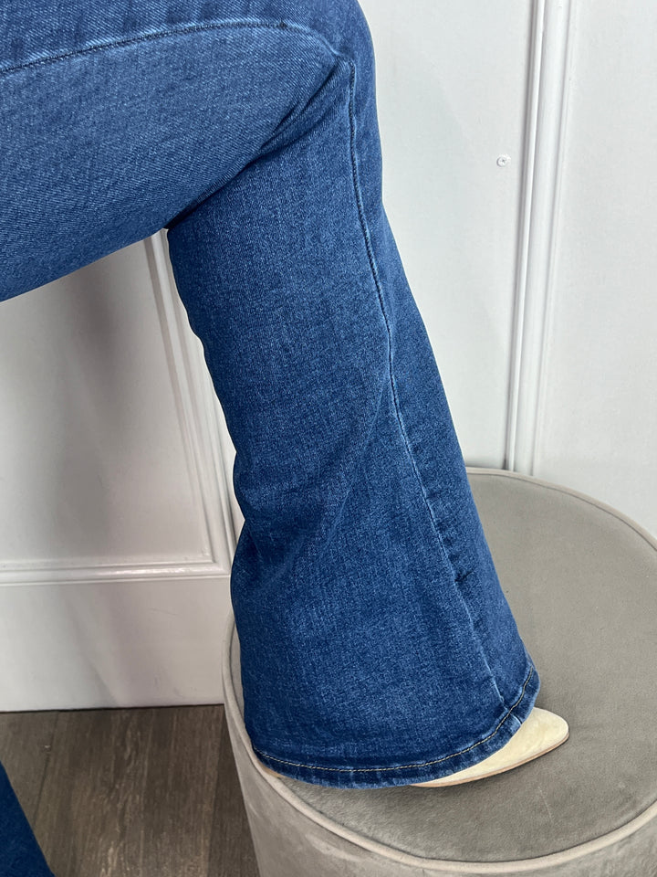 - Model: Een hele mooie flare jeans van het merkje Goodies met een prachtige, donkere wassing. Middelhoge taille, steek- en kontzakken, riemlussen en een ritsgulp met 1 sluitingsknoop.