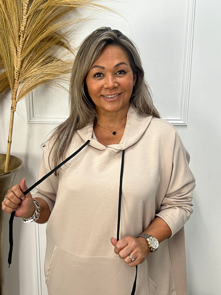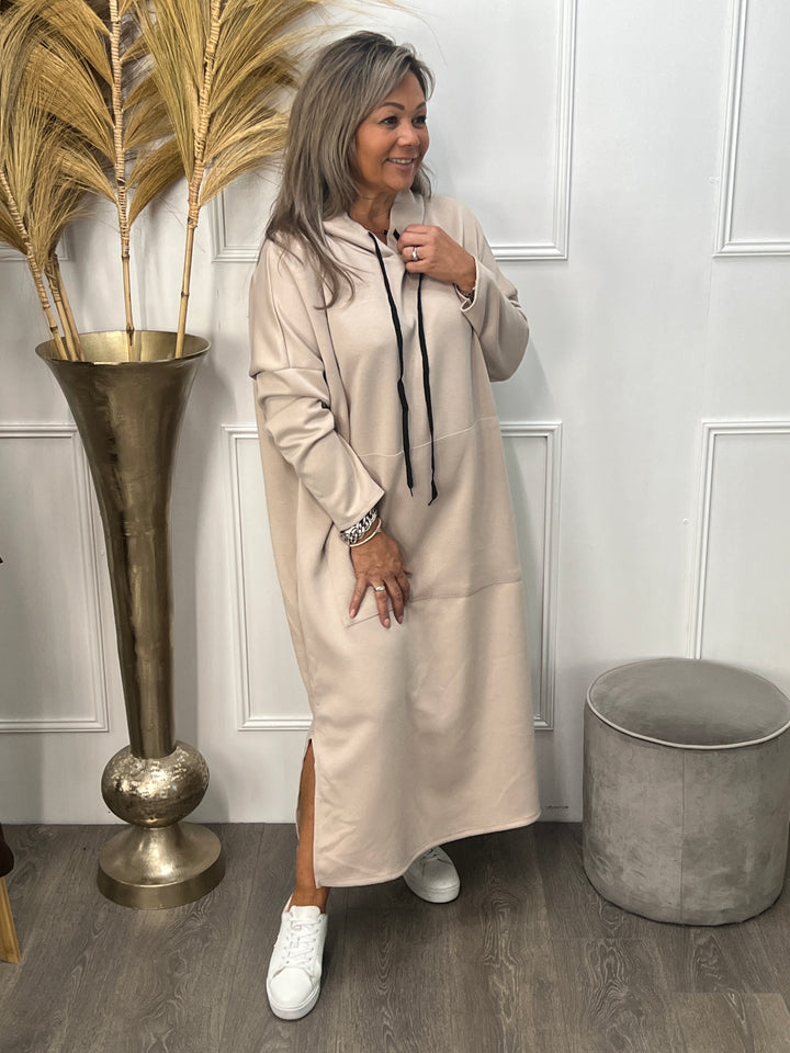 - Model: Dit is echt een leukerd! Hoodie jurk Jolanda is een lange, comfy jurk die stoer oogt en mega lekker zit. Voorzien van een buidelzak aan de voorzijde, splitjes aan de onderkant en uiteraard, hoe kan het ook anders een hoodie capuchon met een aanrijgveter. Verkrijgbaar in verschillende kleuren.