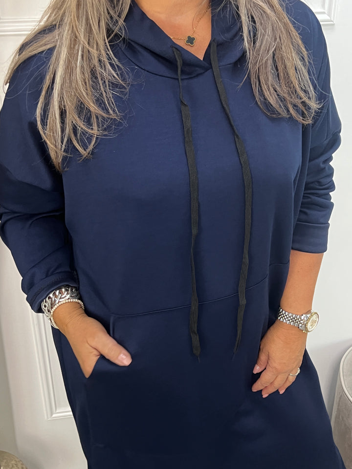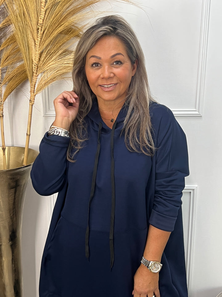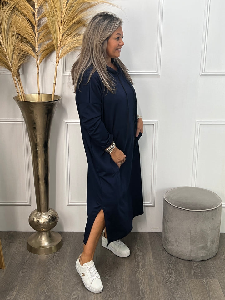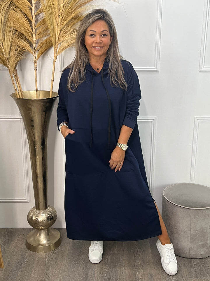 - Model: Dit is echt een leukerd! Hoodie jurk Jolanda is een lange, comfy jurk die stoer oogt en mega lekker zit. Voorzien van een buidelzak aan de voorzijde, splitjes aan de onderkant en uiteraard, hoe kan het ook anders een hoodie capuchon met een aanrijgveter. Verkrijgbaar in verschillende kleuren.