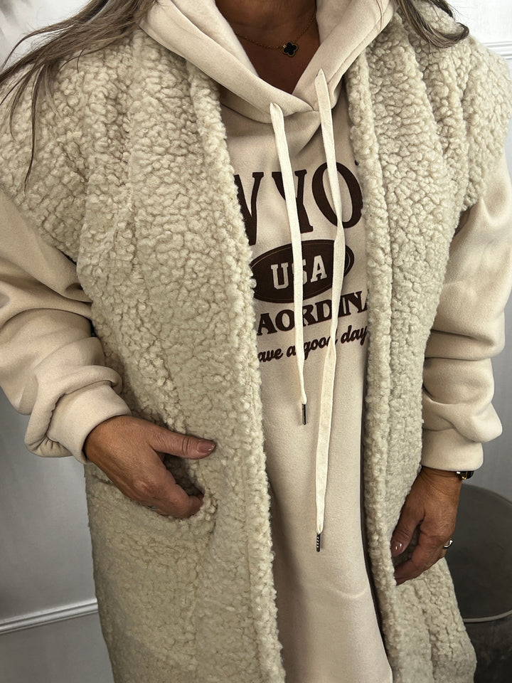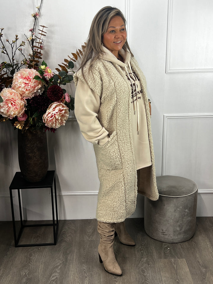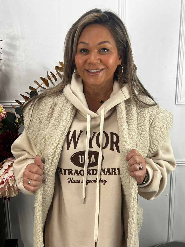 - Model: Super gaaf is deze nieuwe lange teddy gilet. Althans, dat vinden wij. Hoe denken jullie daarover? Leuk om bijvoorbeeld op onze nieuwe New York hoodie te combineren, maar eigenlijk kan deze natuurlijk overal wel op gedragen worden. Echt te leuk. Welke kleur is jouw favoriet?