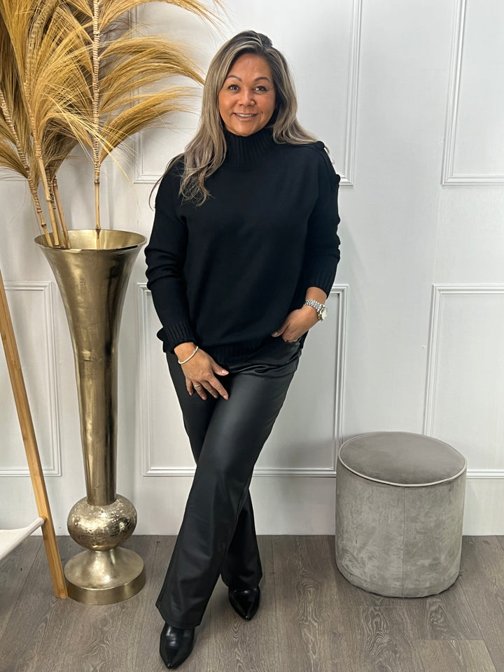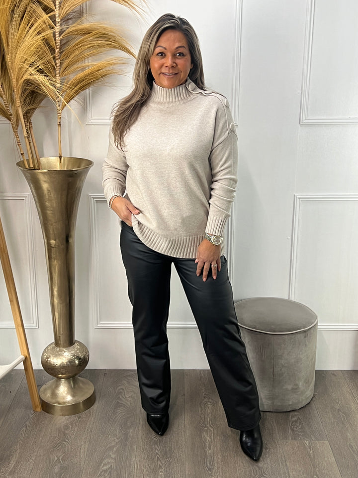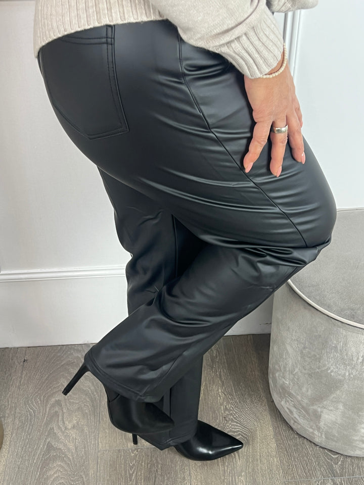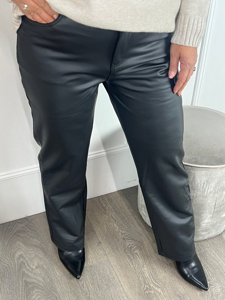 - Model: Een super leuke, mooie, leather look broek met zowel steek- als kontzakken, riemlussen en een ritsgulp met één sluitingsknoop.