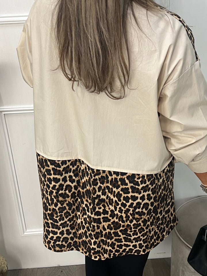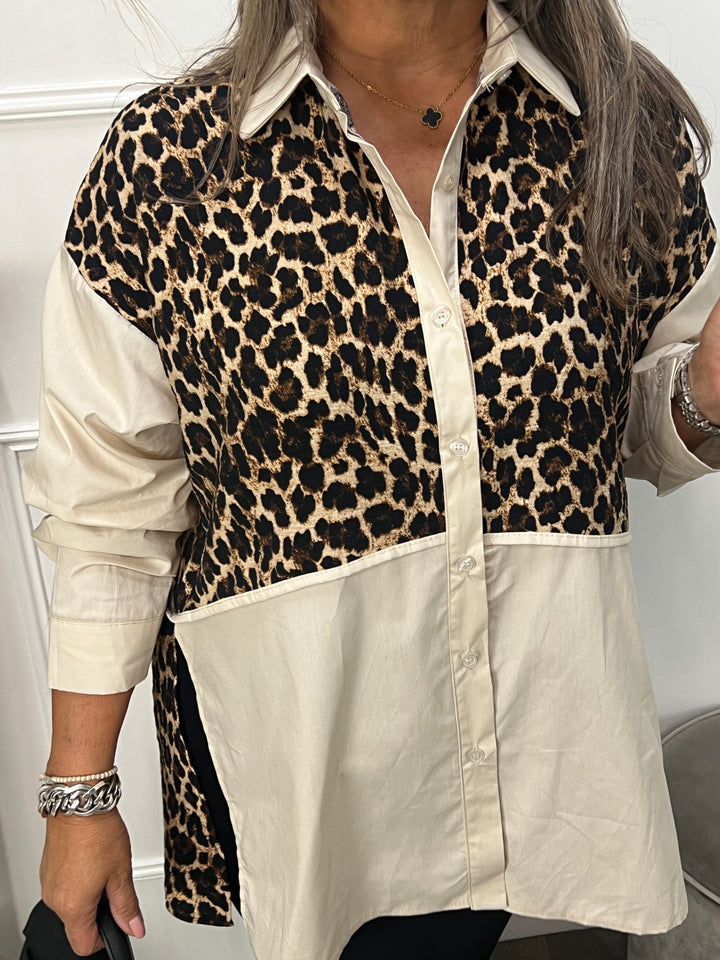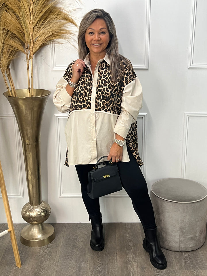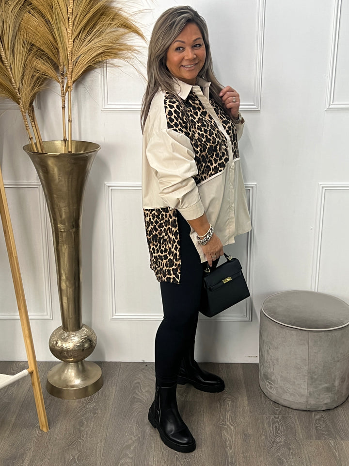 - Model: Een bijzonder leuke blouse met luipaard vlakken, een doorknoop, kraagje en twee diepe splits aan weerszijkanten. Helemaal stoer, helemaal leuk. Hier gecombineerd op onze fijne high waist Norfy legging.