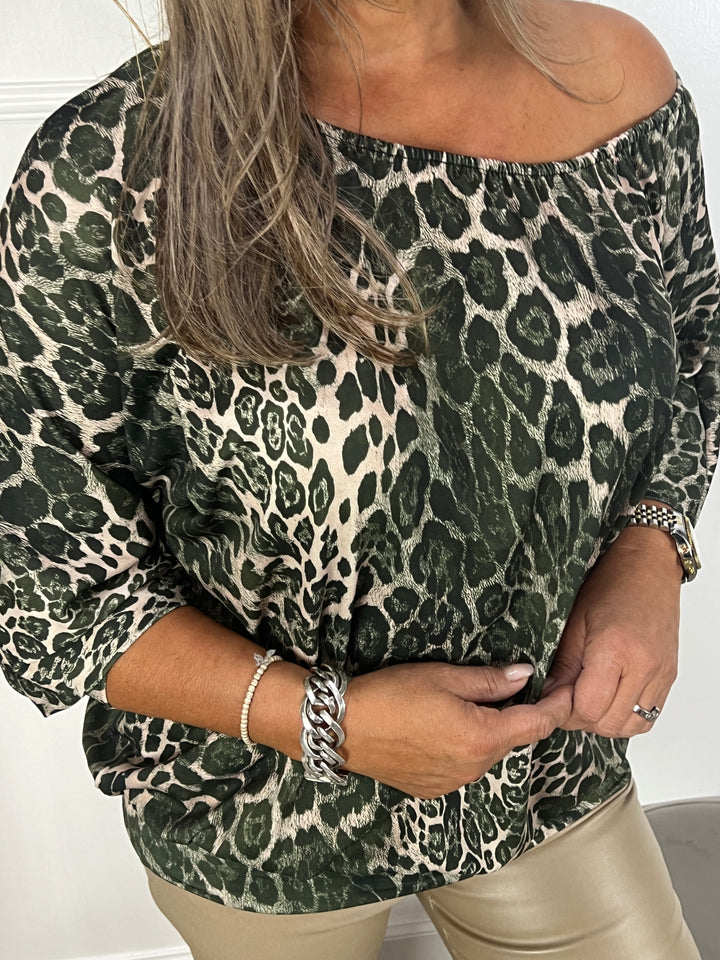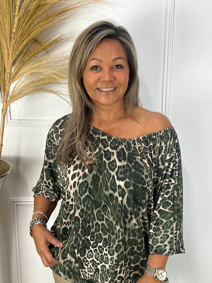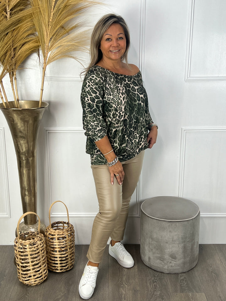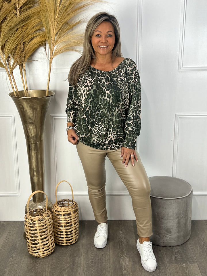- Model: Een mooie, ruime luipaard top met lange mouwen, elastische hals en een brede band aan de onderkant. Kan perfect op onze Bella coating broeken gedragen worden, maar zeer zeker ook op een leuke jeans of een slim fit broek.