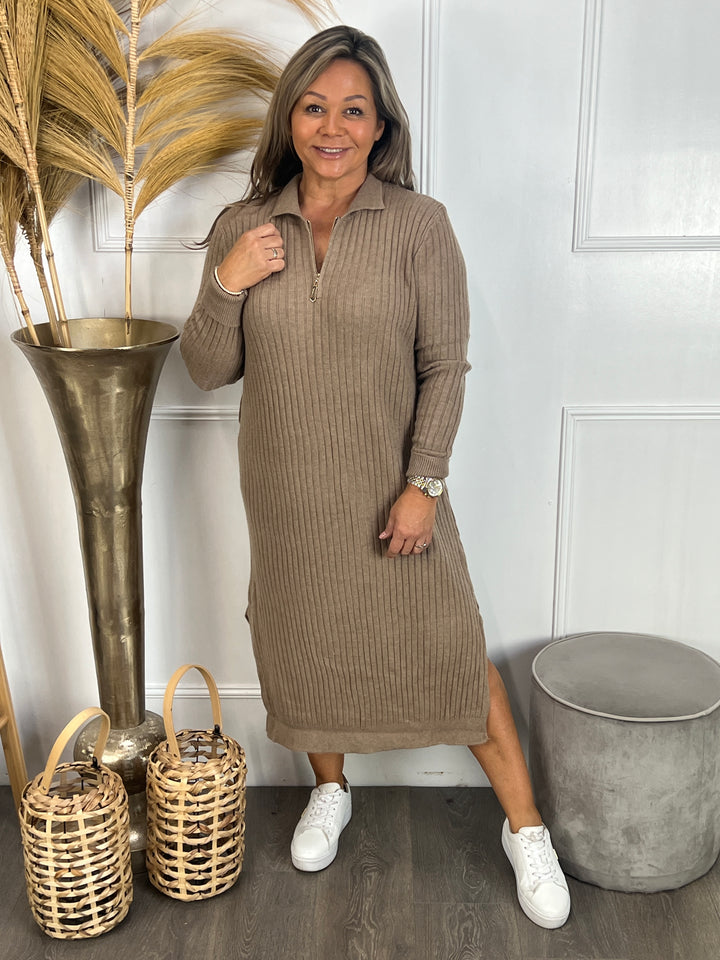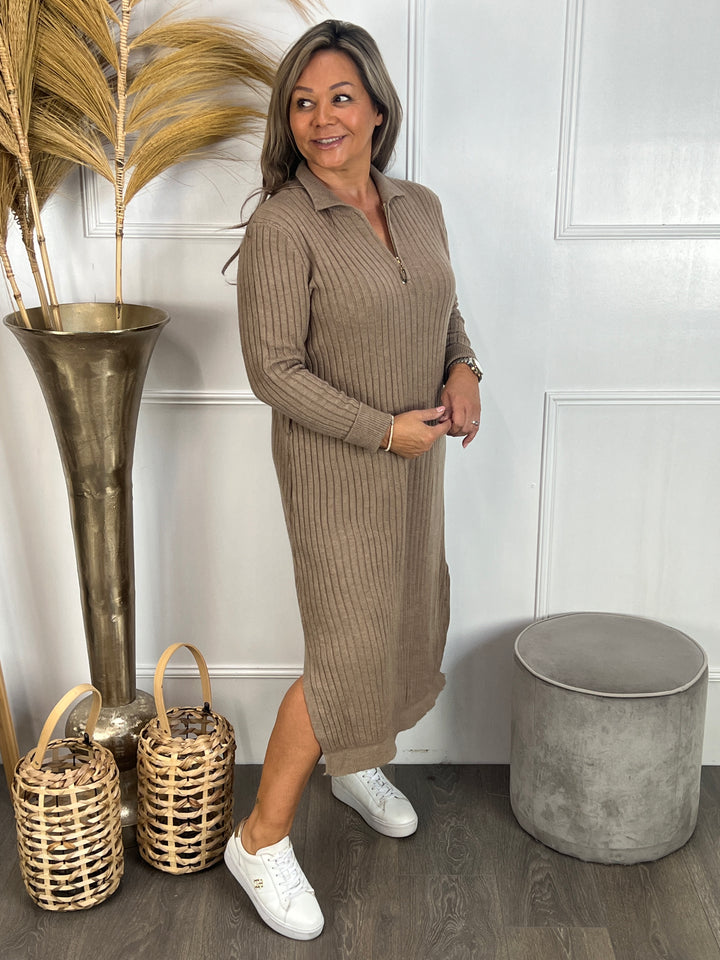 - Model: Kijk eens even hoe leuk Rolinda is! Een lange, comfortabele, zacht gebreide ribbel jurk met een rits aan de voorzijde van de hals, een kraagje en een bijpassende ceintuur.