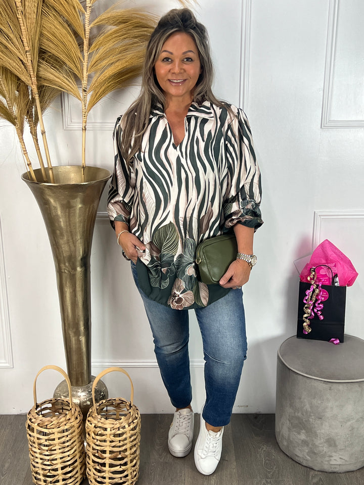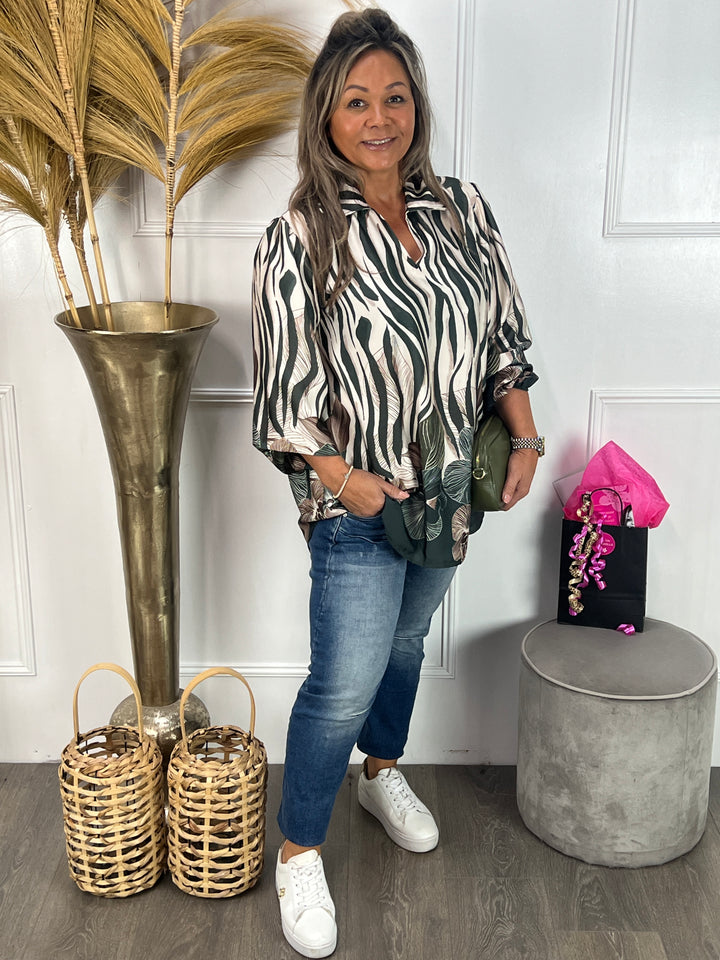- Model: Een hele mooie, silky blouse met v-hals, kraagje, lange mouwen met elastische polsen en een hele gave print. Verkrijgbaar in verschillende warme kleuren. Welke kleur is jouw favoriet?