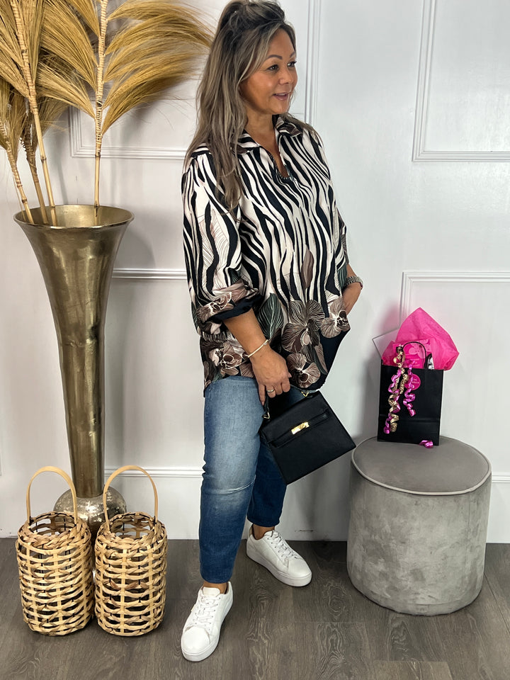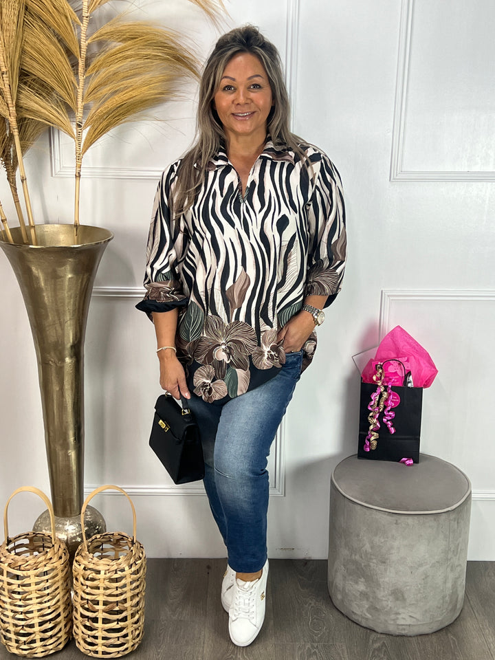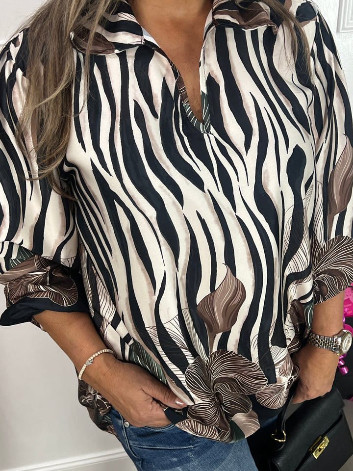 - Model: Een hele mooie, silky blouse met v-hals, kraagje, lange mouwen met elastische polsen en een hele gave print. Verkrijgbaar in verschillende warme kleuren. Welke kleur is jouw favoriet?