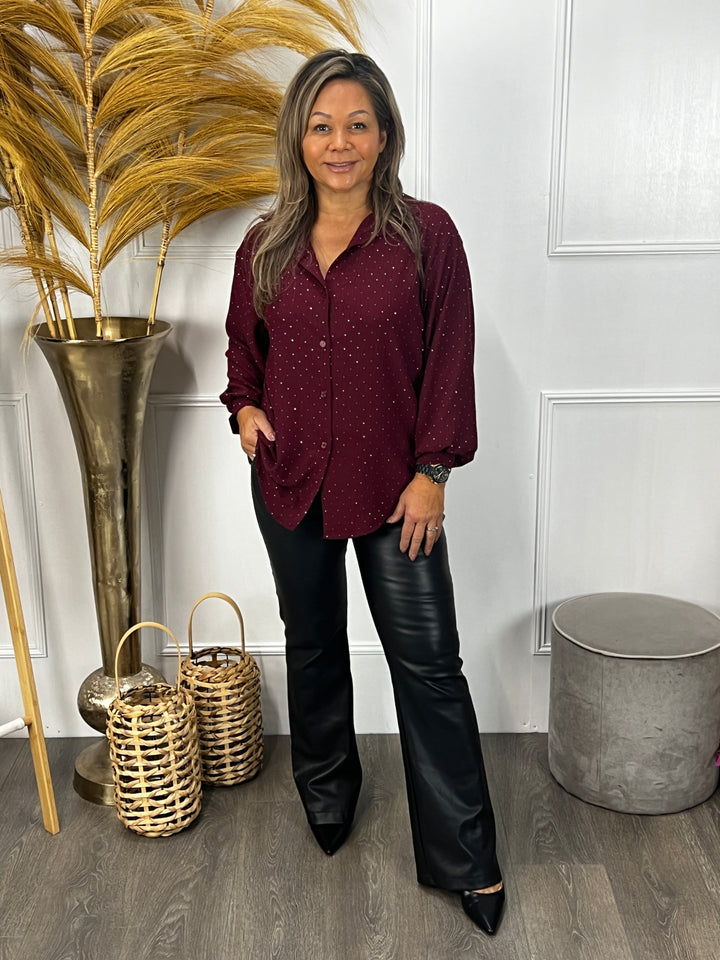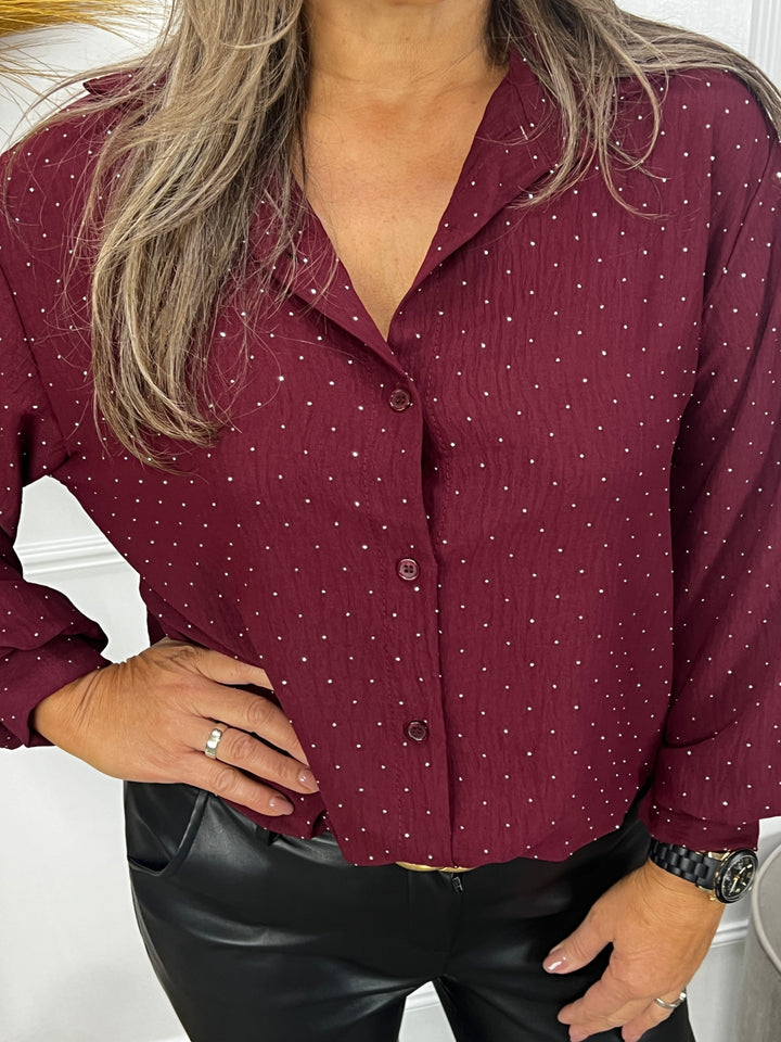 - Model: Een mooie, sprankelende doorknoopblouse met lange mouwen en een kraagje. Verkrijgbaar in diverse kleuren.