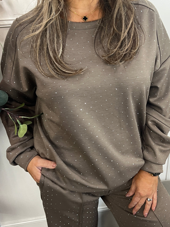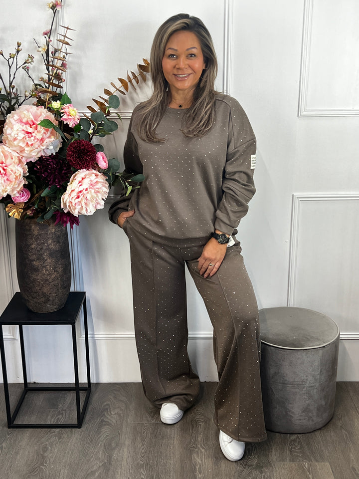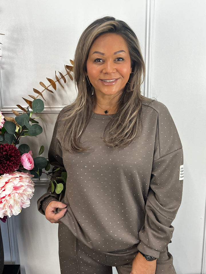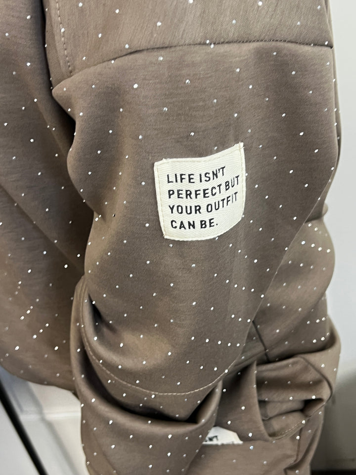 - Model: Een super leuk en comfortabel joggingpak met allemaal glinsterende steentjes. He-le-maal gezellig, toch? Momenteel verkrijgbaar in twee kleuren; zwart en taupe.