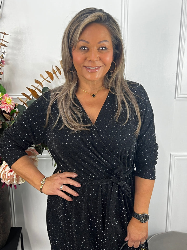 - Model: Een prachtig, stretchy en sparkling jurkje met een overslag v-hals, mooie lange mouwen en een bijpassend ceintuurtje. Met een knipoog naar de feestdagen...