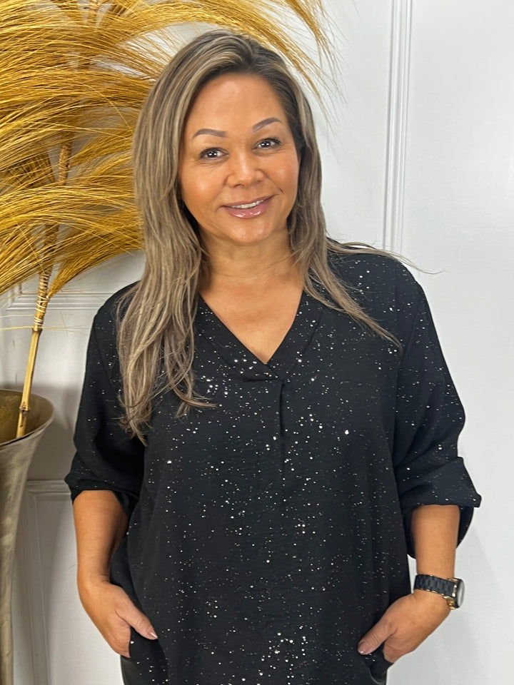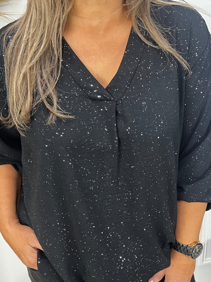 - Model: Heb jij toevallig nog wat ruimte in jouw kast? Laten we het hopen, want voor deze nieuwe sparkle (ballon) top wil jij vast wel wat plaats maken. Een schitterende top met een v-hals en een ballonmodel. Helemaal gezellig en leuk voor de feestdagen, maar zeer zeker ook voor andere (feestelijke) gelegenheden.