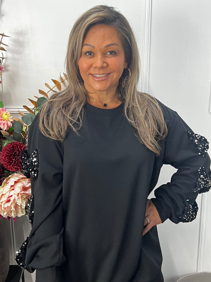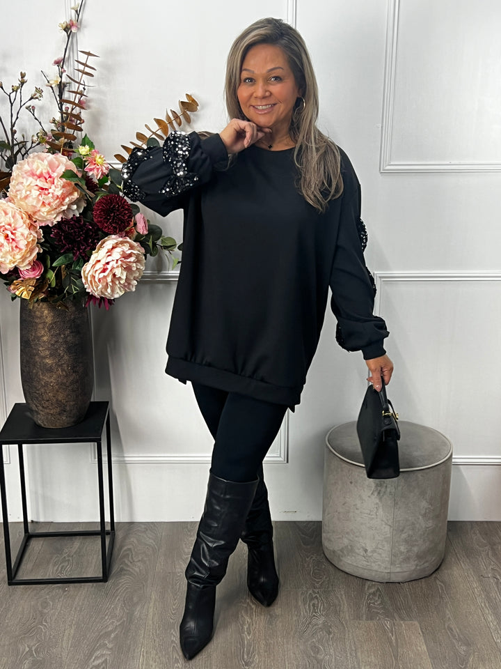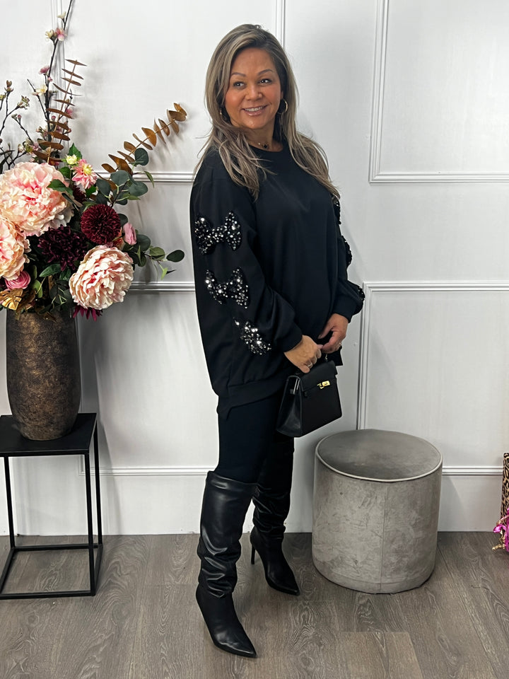 - Model: Een super mooie sweater met hele leuke velvet, pailletten strikken op de mouwen. Sierlijk, vrolijk en vrouwelijk! Deze wil je toch? Hier gecombineerd met onze Nora legging in het zwart.