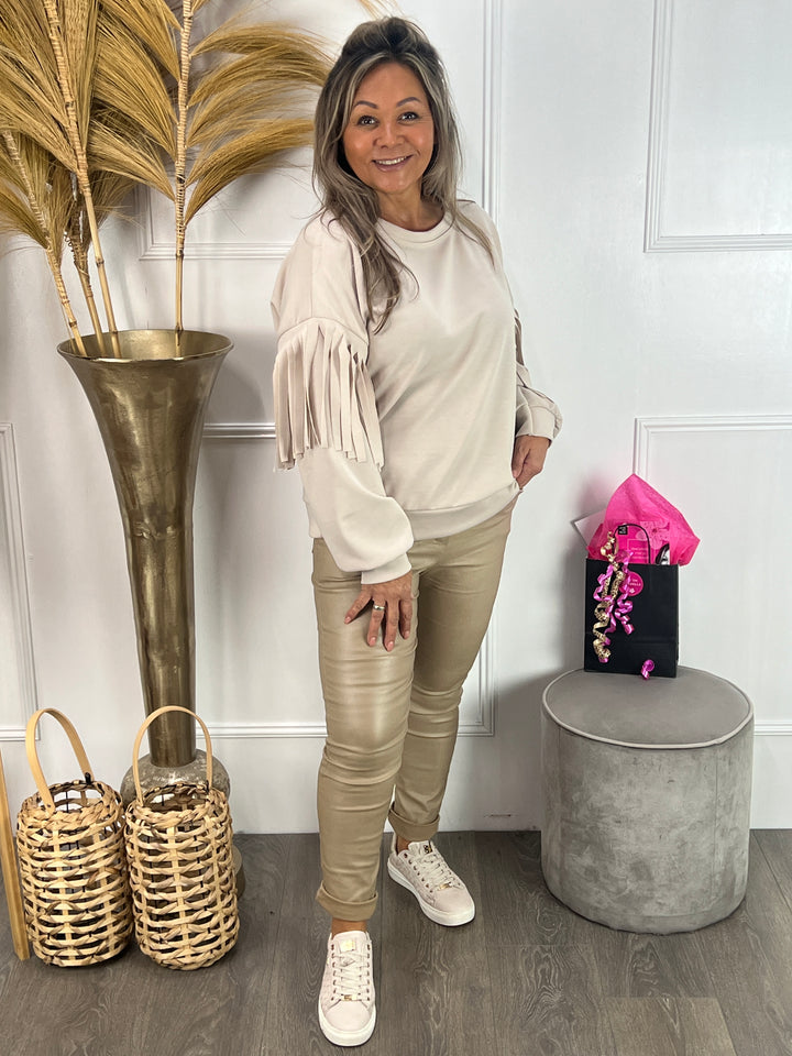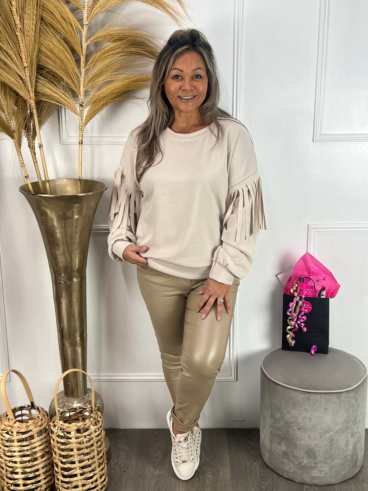 - Model: Superzacht en helemaal on-trend! Deze sweater met speelse fringes rondom de mouwen geeft je outfit een echte Pocahontas-vibe.