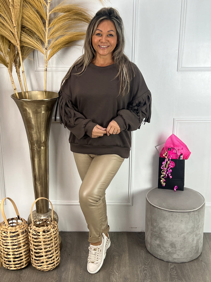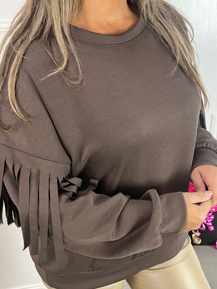 - Model: Superzacht en helemaal on-trend! Deze sweater met speelse fringes rondom de mouwen geeft je outfit een echte Pocahontas-vibe.