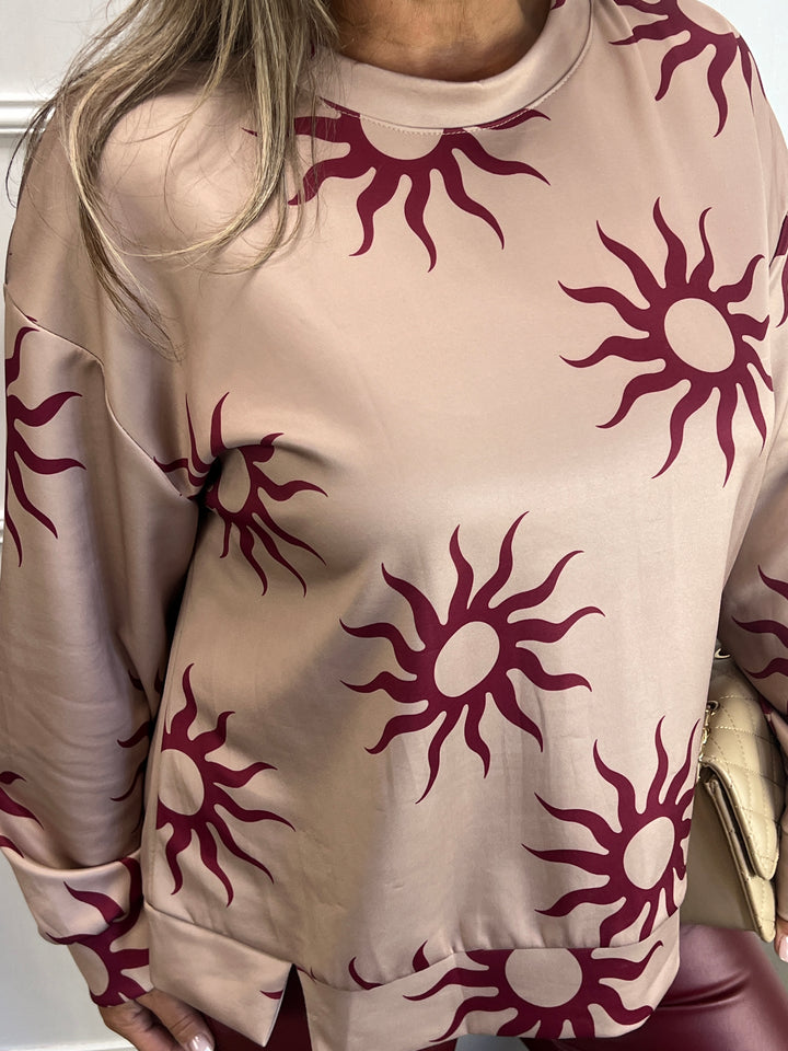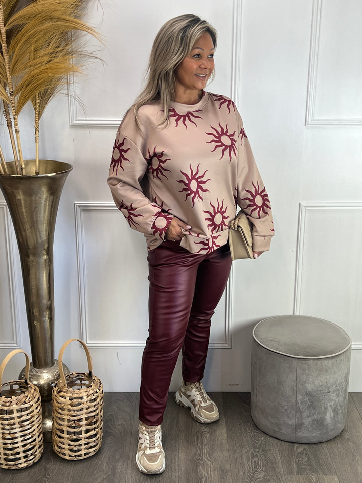 - Model: Wat een super leuke sweater, voorzien van prachtige bordeauxkleurige zonnen. Gemaakt van viscose (katoen) èn polyester met een chique glanslaag.