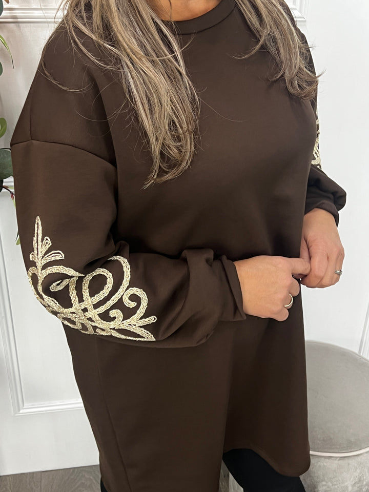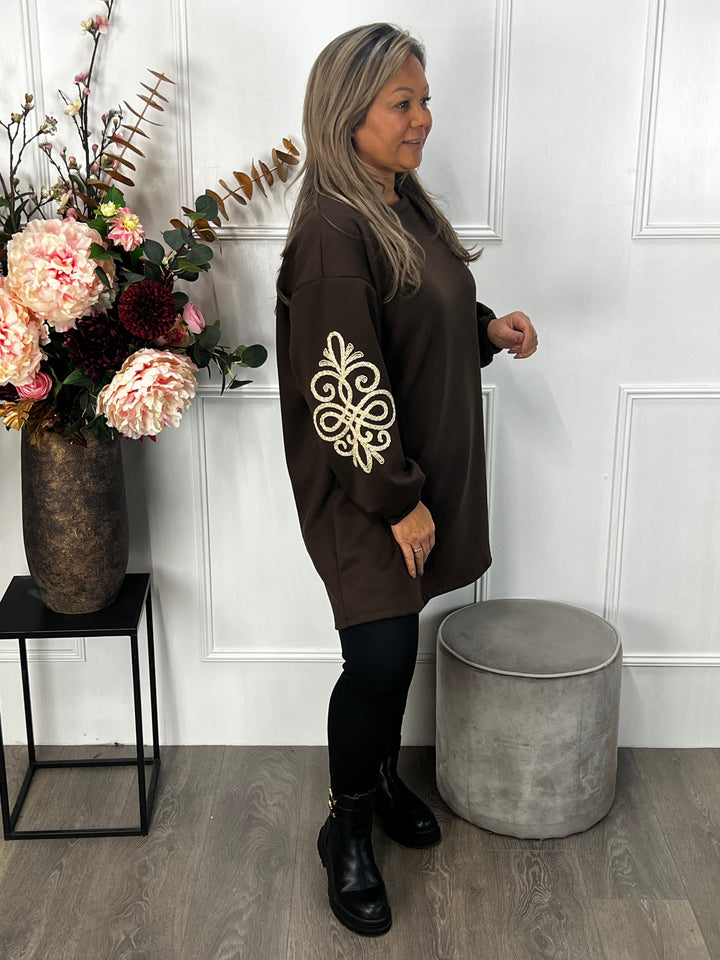 - Model: Een prachtige sweaterdress met hele mooie, chique borduursels op de mouwen. Voorzien van een fleece binnenkant, dus lekker warm en super zacht.