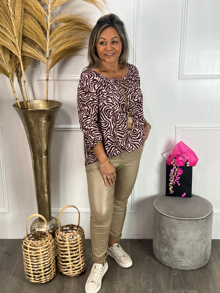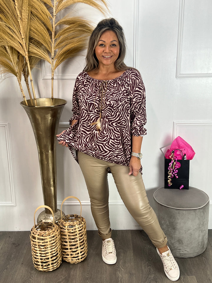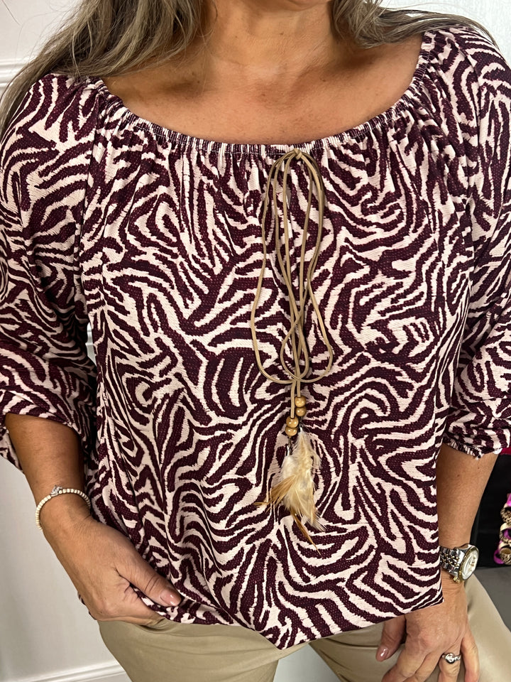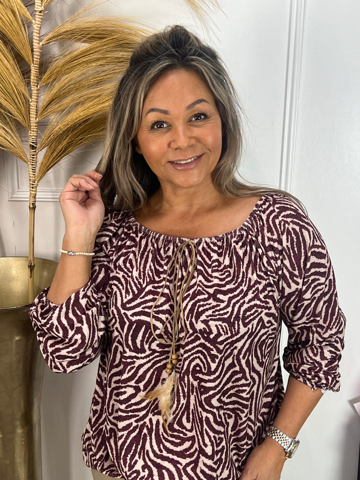 - Model: Een prachtige en leuke blouse voorzien van een mooi animalprintje, een elastische hals, waardoor je lekker kunt spelen met open schouders of juist niet. Ook voorzien van een siertouwtje aan de voorzijde. Lekker ruim te dragen en ook nog eens verkrijgbaar in meerdere warme kleuren.