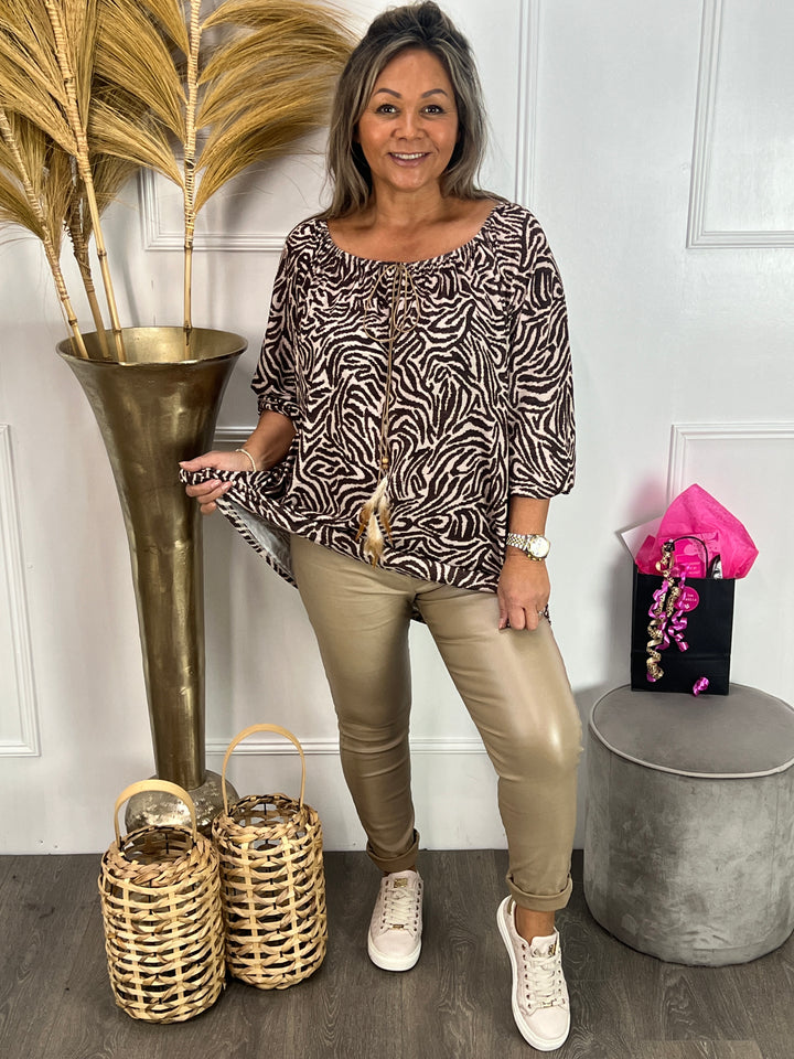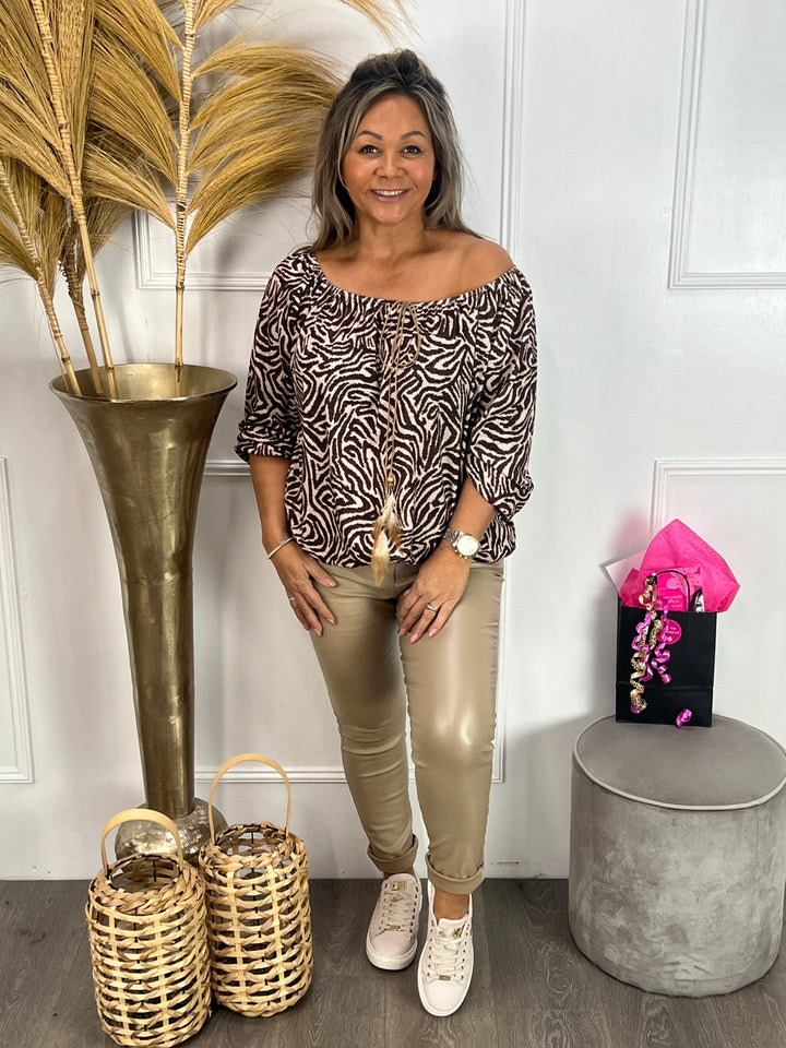 - Model: Een prachtige en leuke blouse voorzien van een mooi animalprintje, een elastische hals, waardoor je lekker kunt spelen met open schouders of juist niet. Ook voorzien van een siertouwtje aan de voorzijde. Lekker ruim te dragen en ook nog eens verkrijgbaar in meerdere warme kleuren.