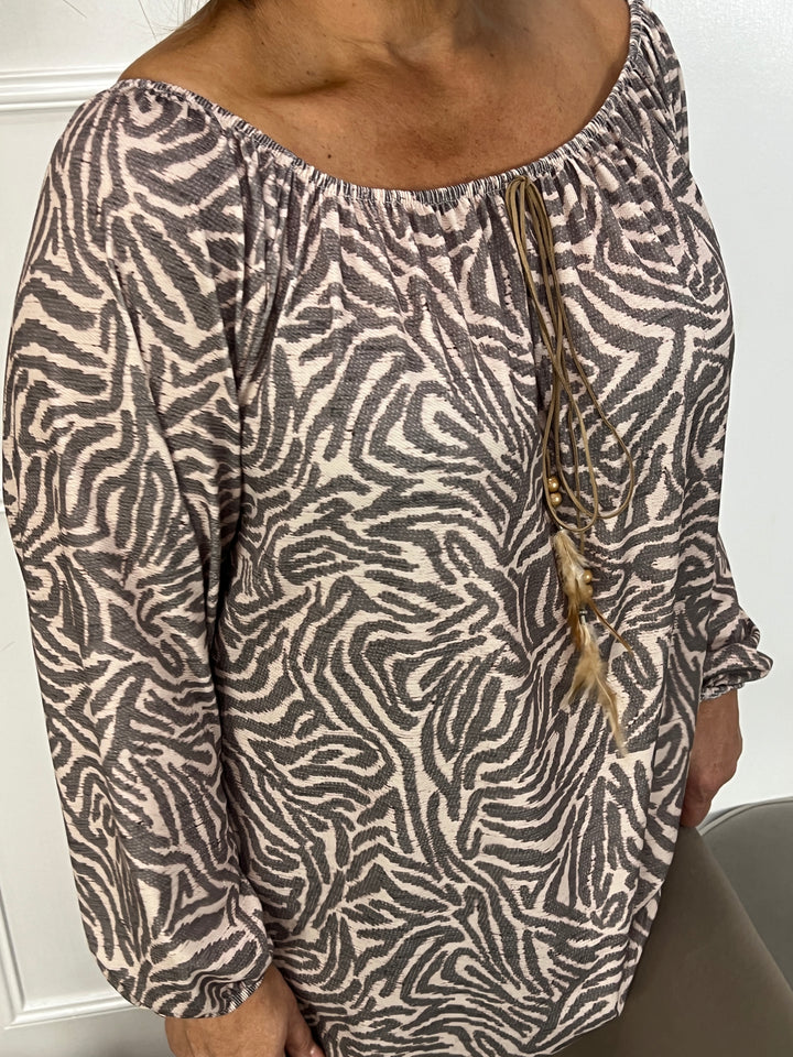 - Model: Een prachtige en leuke blouse voorzien van een mooi animalprintje, een elastische hals, waardoor je lekker kunt spelen met open schouders of juist niet. Ook voorzien van een siertouwtje aan de voorzijde. Lekker ruim te dragen en ook nog eens verkrijgbaar in meerdere warme kleuren.