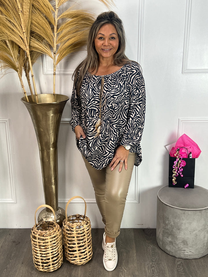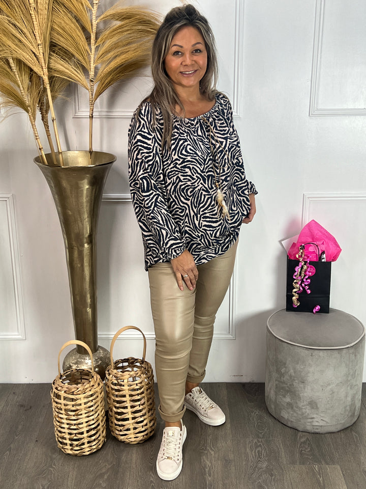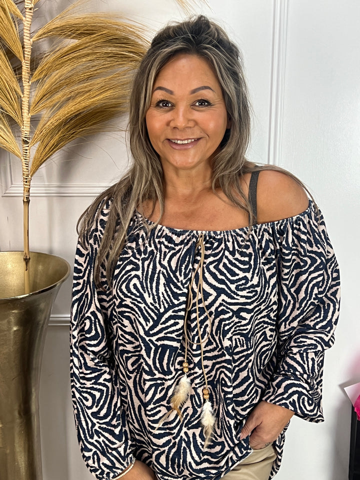 - Model: Een prachtige en leuke blouse voorzien van een mooi animalprintje, een elastische hals, waardoor je lekker kunt spelen met open schouders of juist niet. Ook voorzien van een siertouwtje aan de voorzijde. Lekker ruim te dragen en ook nog eens verkrijgbaar in meerdere warme kleuren.