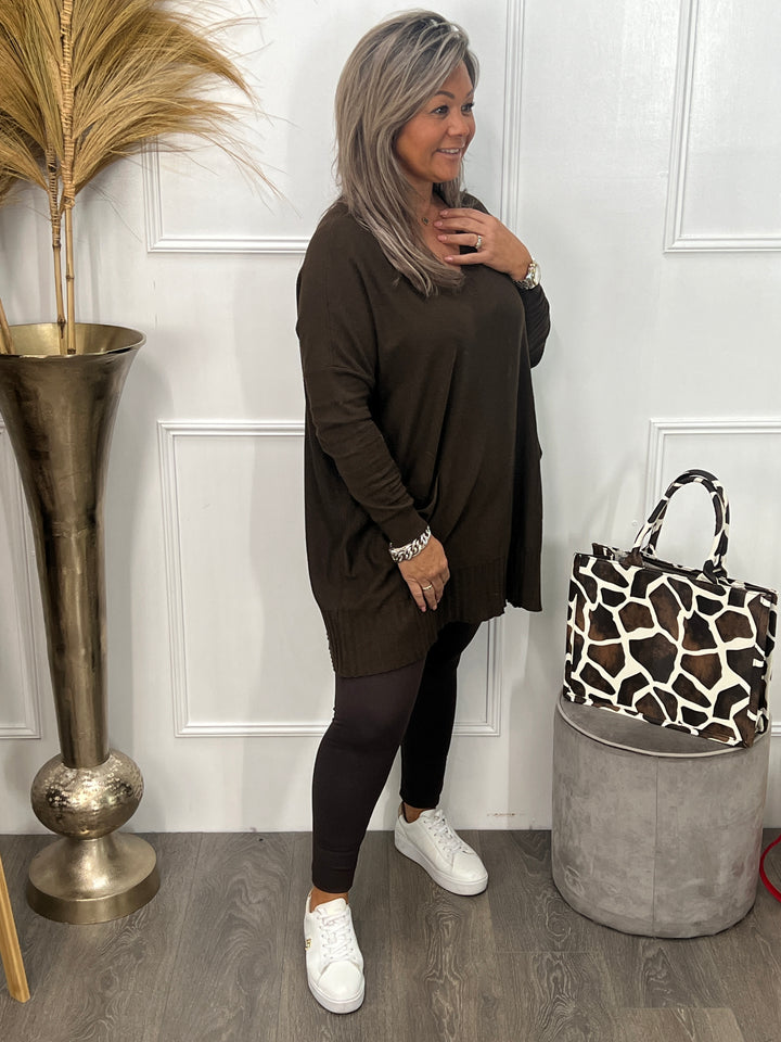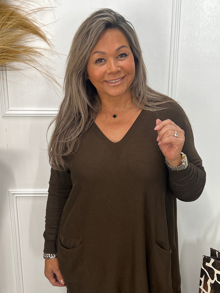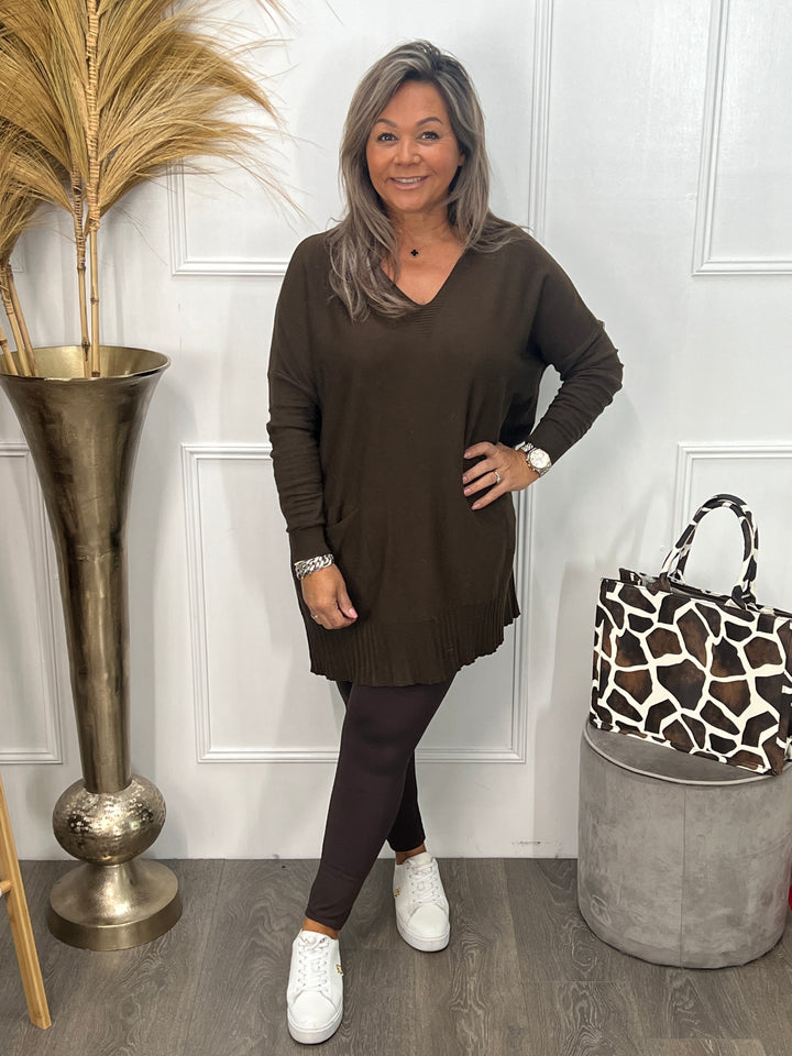 - Model: Een hele fijne, zachte trui met lange mouwen, een v-hals, ribbelrand aan de onderkant en voorzien van twee zakjes aan de voorzijde.