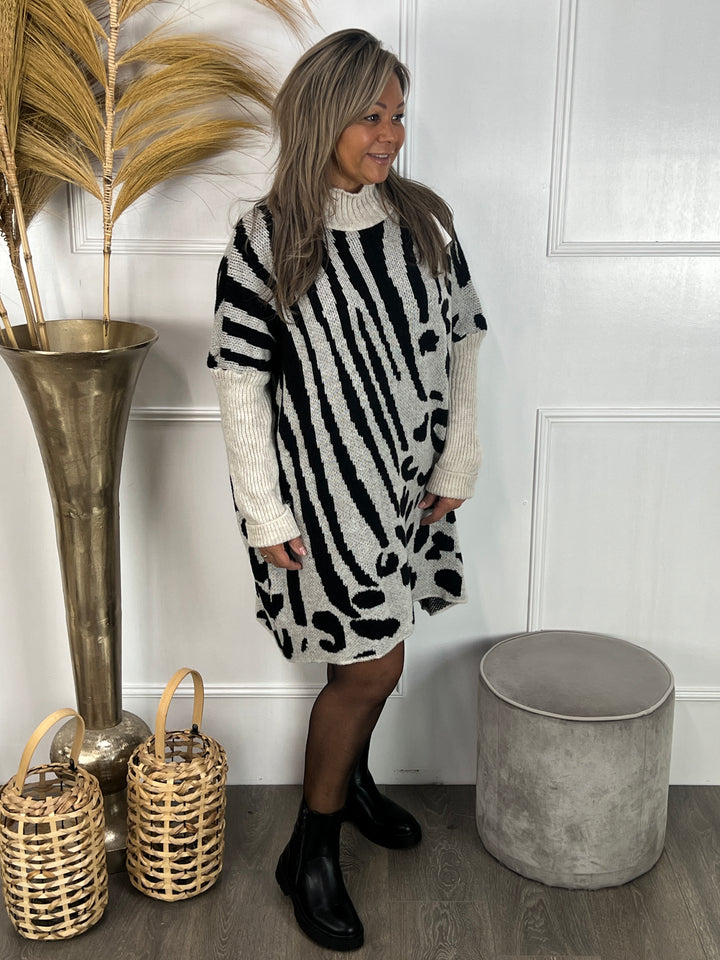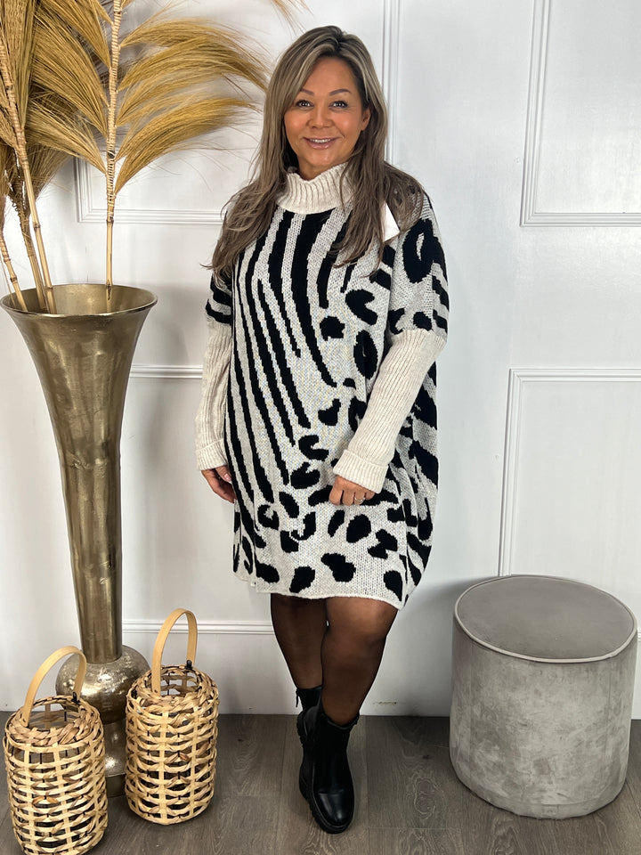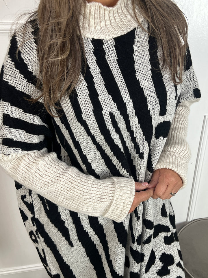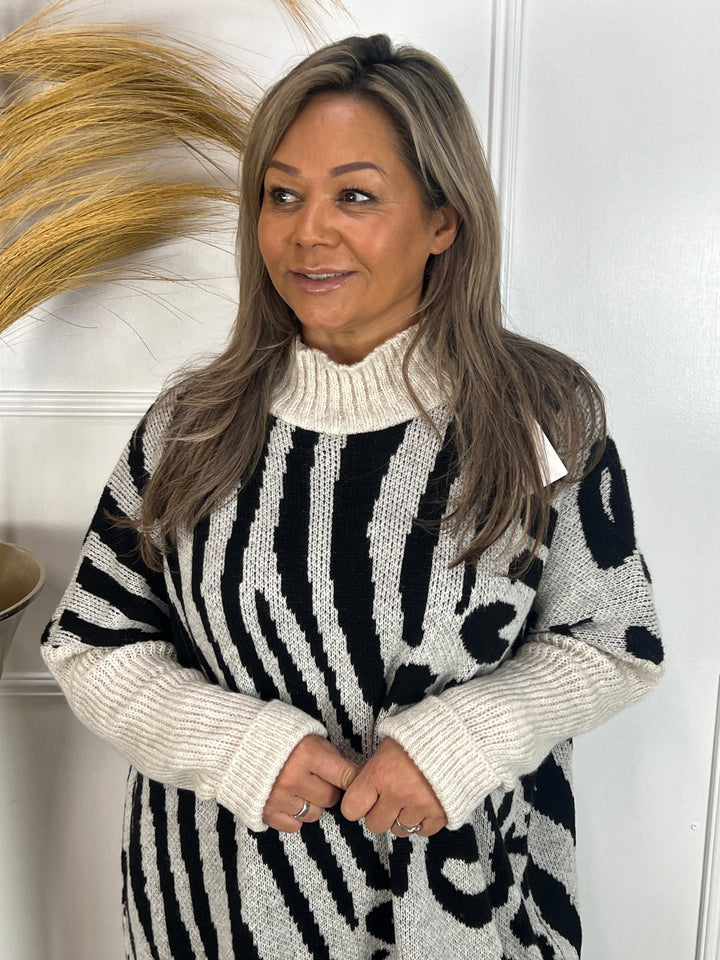 - Model: Weer zo'n leukerd van een trui. Lekker ruim te dragen, voorzien van verschillende soorten dieren "vlekken", een ribbel mouw en ribbel turtle-neck.