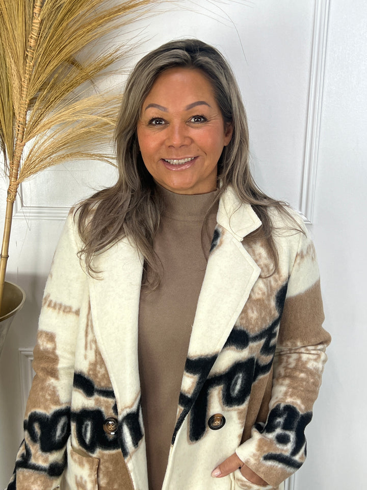 - Model: Super leuke tussenjas met 1 sluitingsknoop aan de voorzijde en twee grote brede jaszakken. Voorzien van de kleuren beige, room en zwart. Echt een leukerd!